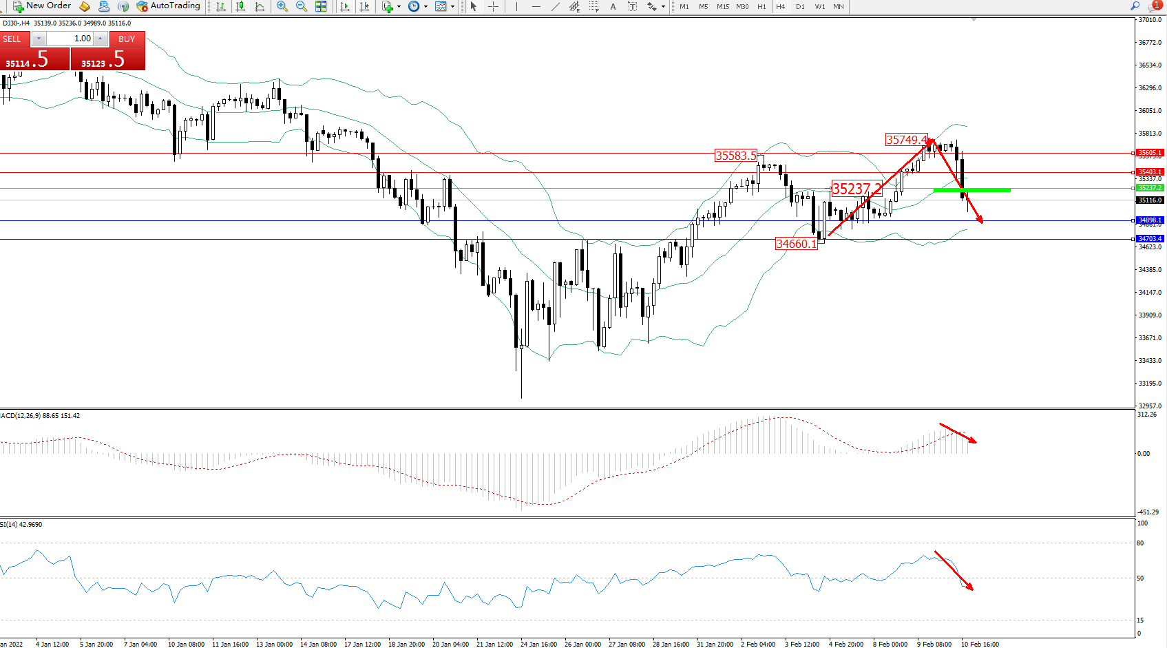技术点评:多头动力延续布林带指标通道上轨附近持续震荡上扬,高位抵达35749附近窄幅整理后急速下挫,空头动力短期有进一步回调态势, 布林带指标呈张口走势后开始缓慢收口,MACD指标处于处于多头区域维持弱势缓慢下行,RSI指标处于多头区域维持整理平移后急速下挫至50均衡线下侧徘徊;