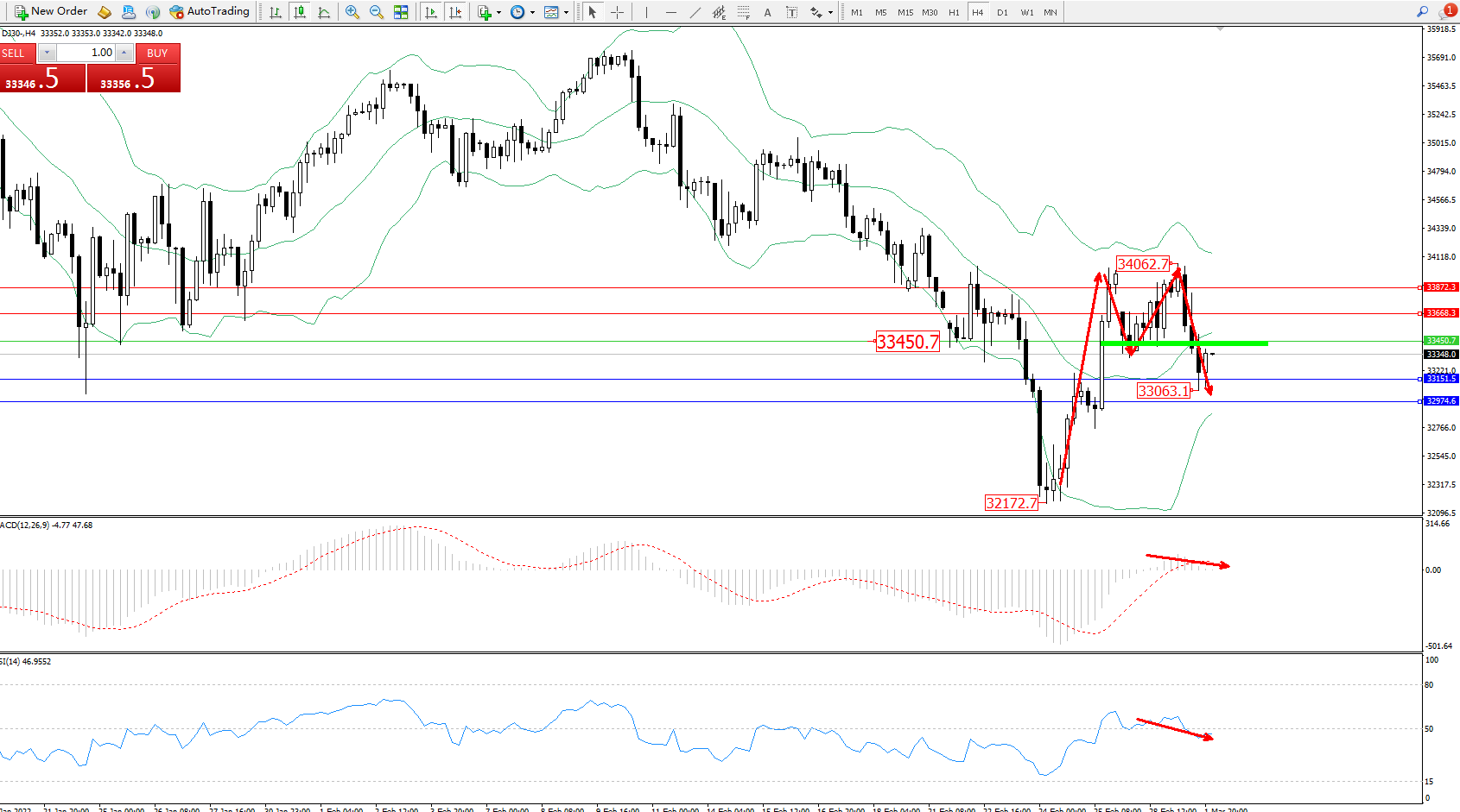 交易策略:33450下方看跌,目标33151、32974
