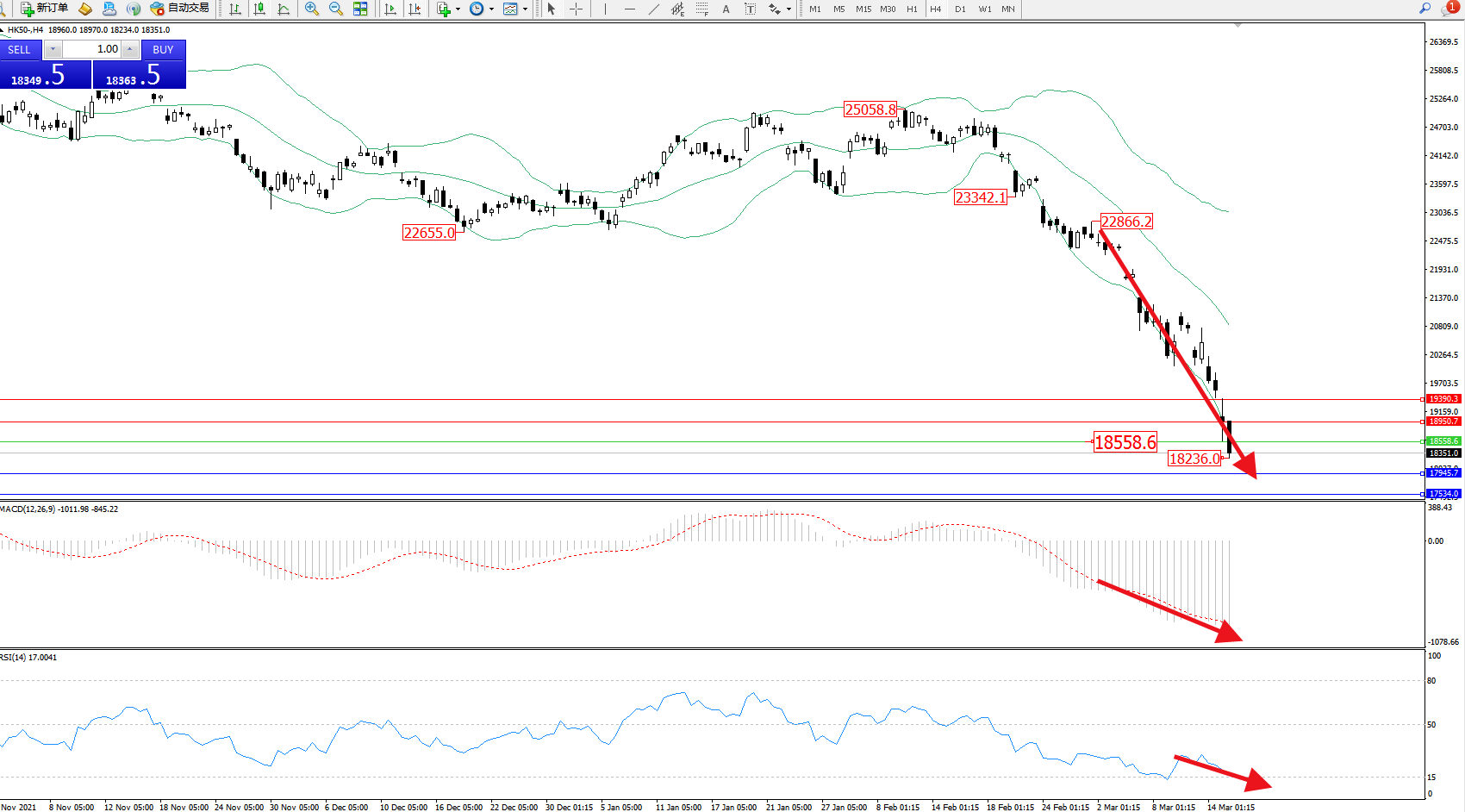 香港恒生指数3月15日(周二)收盘下跌1116.58点,跌幅5.72%,报18415.08点;港股午后再度遭到恐慌式抛售潮,恒生科技指数大幅收跌8.1%再创历史新低,早盘曾一度转涨近1.7%,恒指亦大跌5.72%再度跌超千点,跌破19000点关口,俄乌第四轮谈判因技术故障暂停,市场一片哀嚎。大型科技股继续领跌大市,阿里巴巴、京东跌超10%均创新低,腾讯跌破300港元大关,南下资金逆势加仓,全天净买入93.84亿港元,为连续第15日净买入。