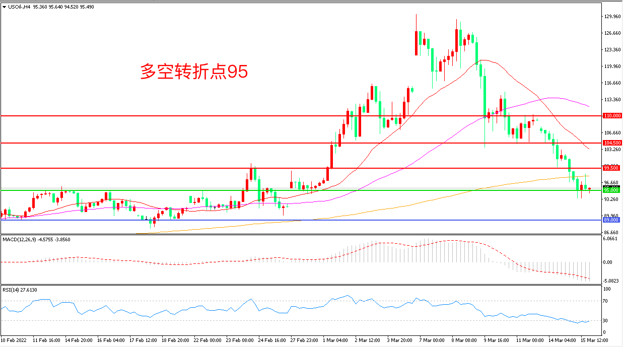 4小时图看,油价连续下破后整体表现低迷,95美元成为多空分水岭,MACD绿柱增加,RSI指标走平,日内震荡下行概率较大。