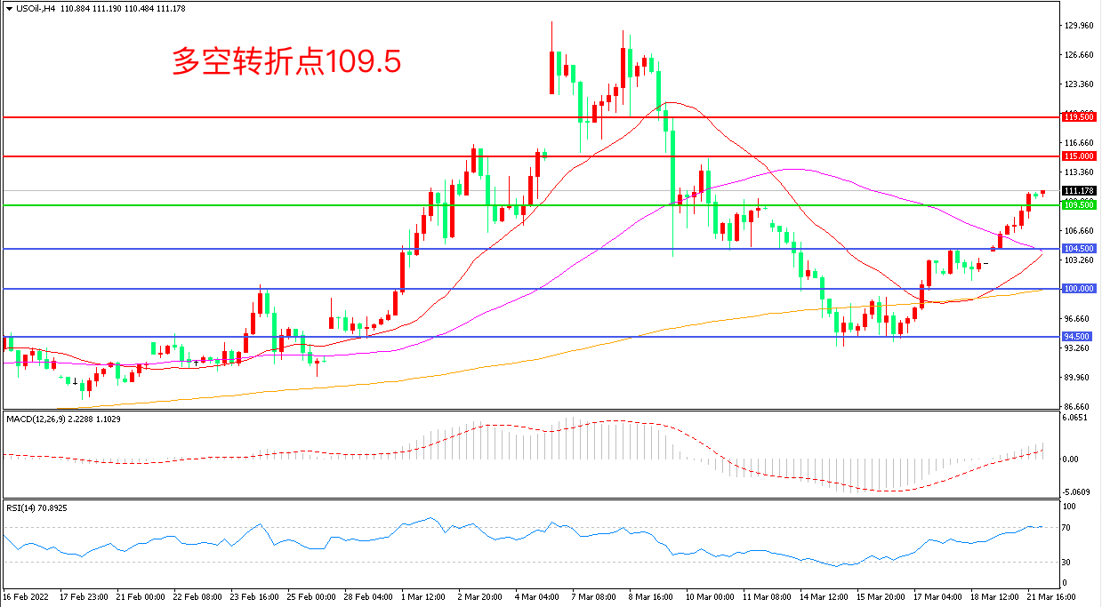 周一(3月21日),克里姆林宫表示,与乌克兰谈判尚未达成协议,而也门的胡塞武装又对沙特阿拉伯能源和海水淡化设施发动一系列导弹和无人机袭击,可能会对未来的供应产生影响,美国WTI原油大幅飙升,收报110.58美元/桶。目前原油市场主要矛盾点已经从前期的需求弱势担忧,迅速转移至供给风险可能引发的供应紧缩,叠加近期中东地区乱局频发的局势,油价延续强势概率较大。