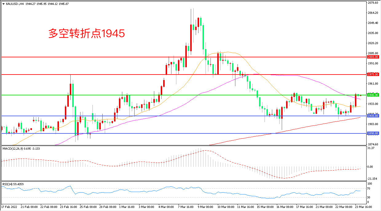 周三(3月23日),市场对俄乌局势保持高度敏感,原油和天然气走高重燃通胀担忧,现货黄金小幅走高,收报1944.94美元/盎司。近期美俄关系再度紧张,拜登出席北约峰会时将敲定可能包括对俄新制裁的新举措,而俄罗斯外交部已经宣布驱逐美国驻俄外交官,重点关注俄乌局势报道,金价随时可能再度冲高。