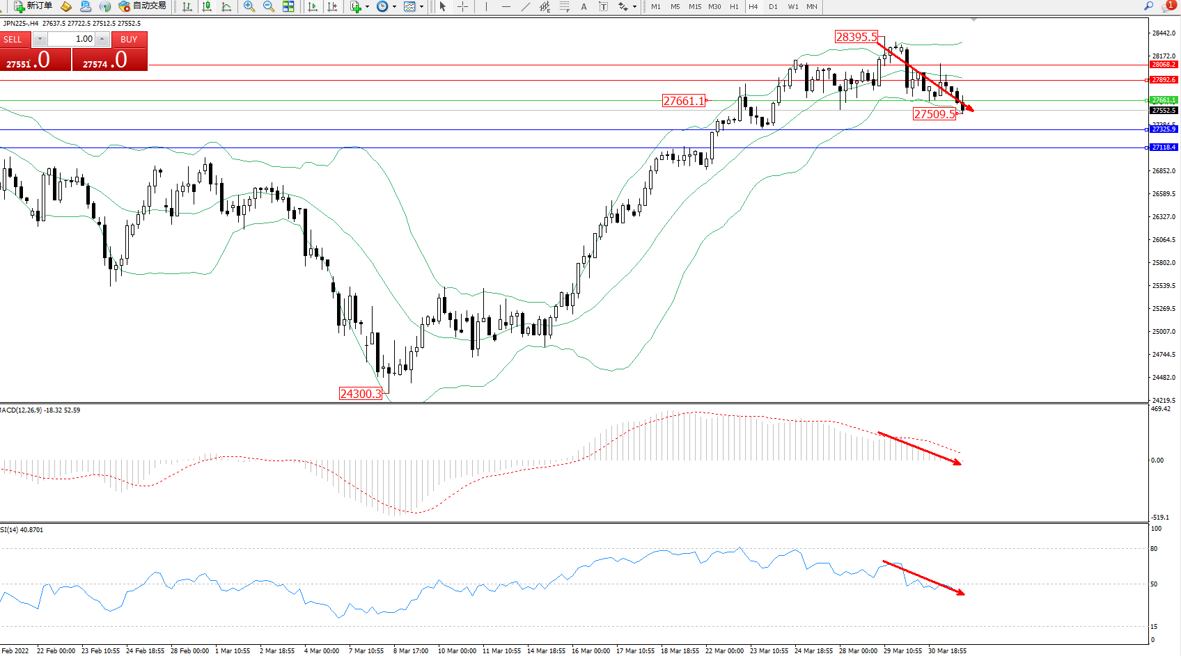 技术点评:高位空头动力维持震荡缓慢整理向下移动,抵达27509位置节点后有继续向下移动态势,布林带指标呈收口走势后开始有缓慢张口走势迹象,MACD指标处于多头区域维持弱势整理缓慢下行至0轴线附近徘徊,RSI指标处于50均衡线附近窄幅整理后进入空头区域整理;
