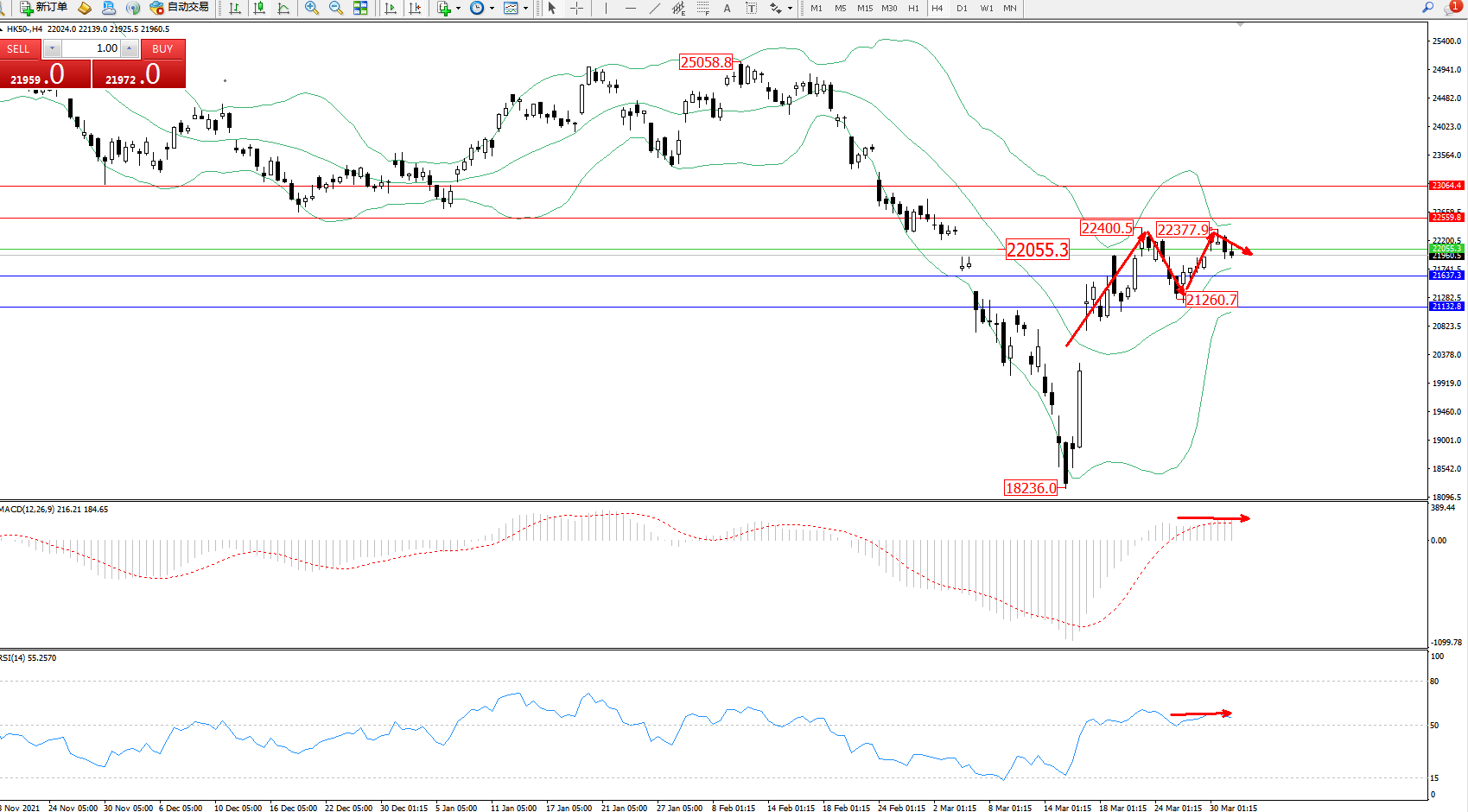 技术点评:多头动力延续布林带指标通道中上轨区间持续震荡上扬,高位抵达22377位置节点后回撤,短期或纠结于中上股轨区间徘徊,布林带指标呈收口走势后开始平移,MACD指标处于0轴线上方弱势徘徊,RSI指标处于50均衡线上側窄幅整理中;