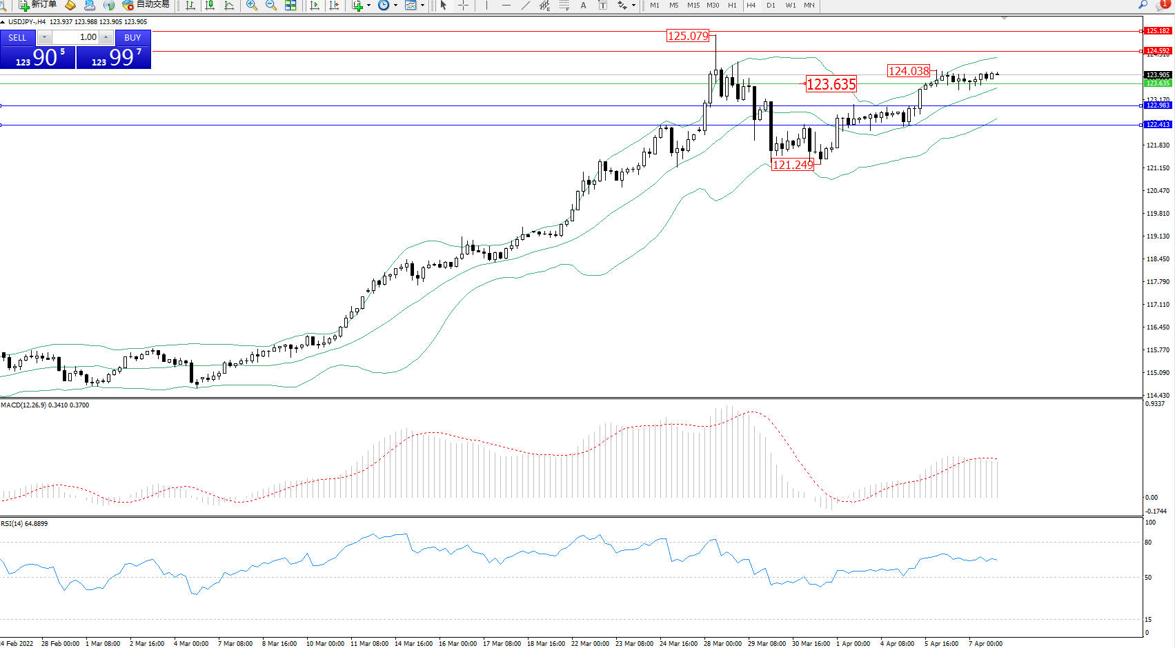技术点评:多头动力延续布林带指标通道中上轨区间持续震荡上扬,高位抵达124.038位置节点后开始整理平移,短期多头上扬趋势或将持续,布林带指标呈上行趋势拉升态势良好,MACD指标处于多头区域高位维持整理平移中,RSI指标处于多头区域维持弱势徘徊中;