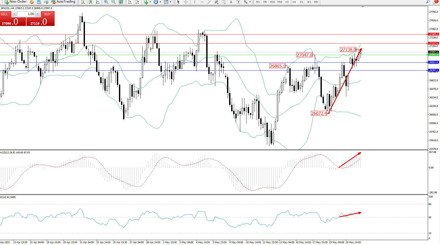 日经225指数5月23日(周一)收盘上涨279.47点,涨幅1.05%,报27018.50点。日本朝日电视台消息,日本首相岸田文雄与美国总统拜登23日在东京举行会谈,日本将加入由拜登主导的“印太经济框架”。
