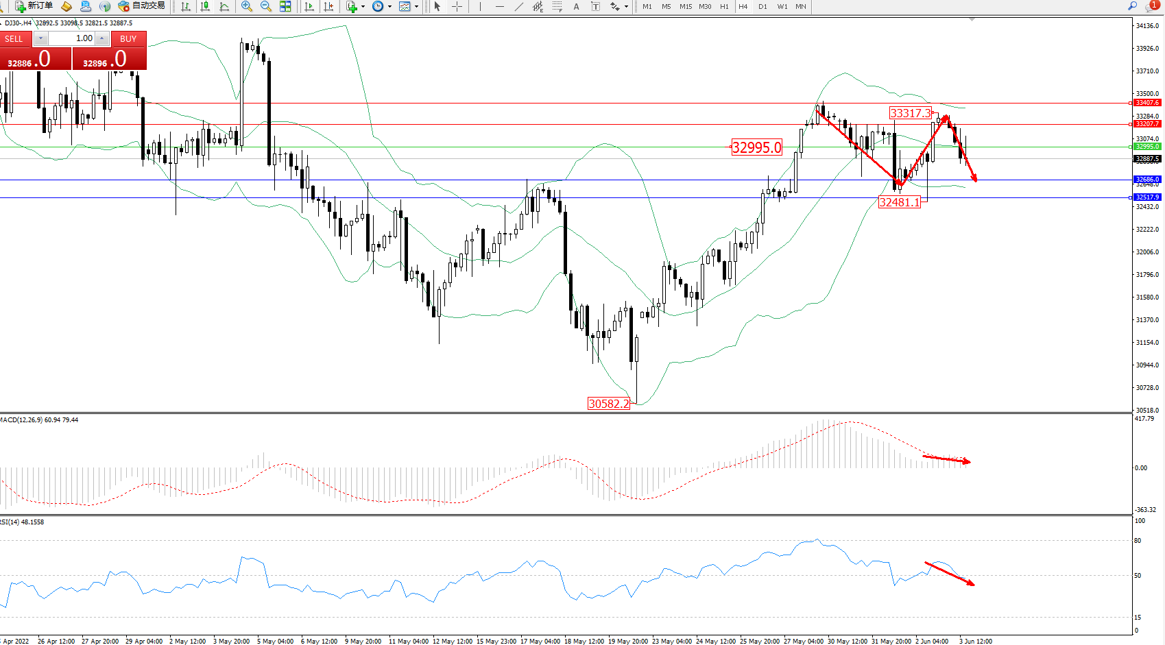 道琼斯工业平均指数收跌348.58点,跌幅1.05%,报32899.70点,本周累跌0.94%。非农数据超预期强化美联储激进加息前景。美国5月非农就业人口增加39万人,劳动力市场吃紧的状况未如FED所愿缓解,失业率为3.6%。