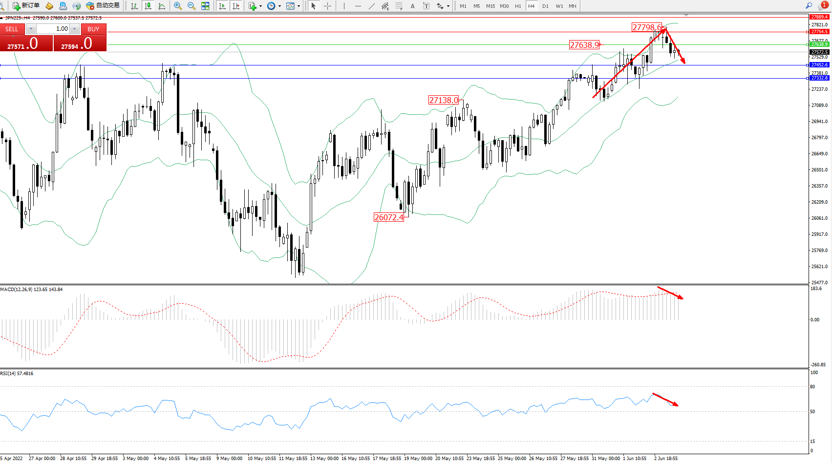技术点评:多头动力延续布林带指标通道中上轨区间持续震荡上扬,高位抵达27798位置节点后遇阻回撤,短期高位或维持震荡走势,布林带指标呈上行趋势走势态势良好,MACD指标处于多头区域维持整理,RSI指标处于多头区域维持震荡缓慢下移;