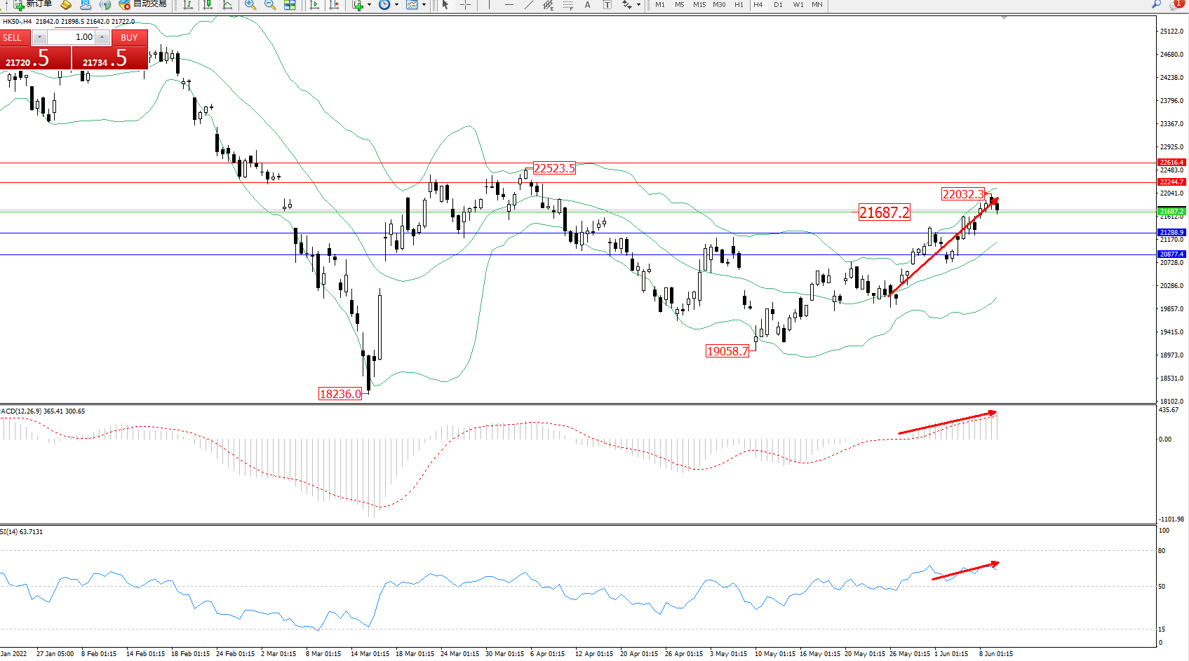 技术点评:多头动力延续布林带指标通道中上轨区间持续震荡上扬,高位抵达22032附近节点后整理,短期多头动力依旧有进一步拉升态势,布林带指标呈缓慢张口走势不断上移,MACD指标处于多头区域维持整理缓慢上行,RSI指标处于多头区域维持窄幅整理;