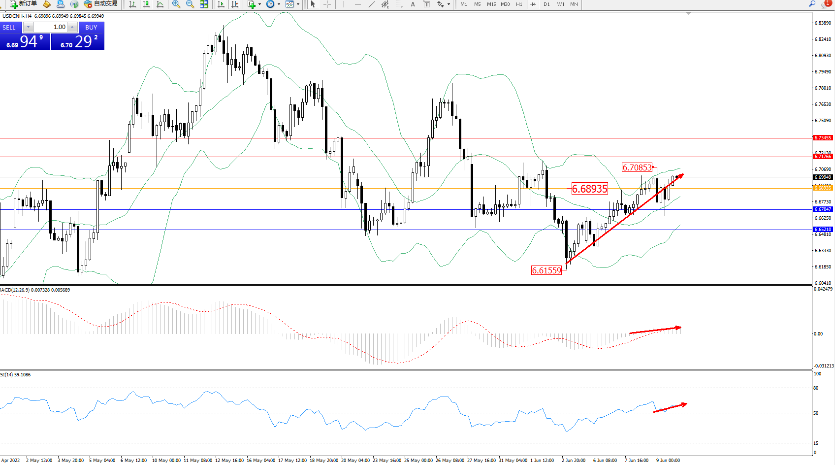 交易策略:6.68935上方看涨,目标6.71766、6.73455