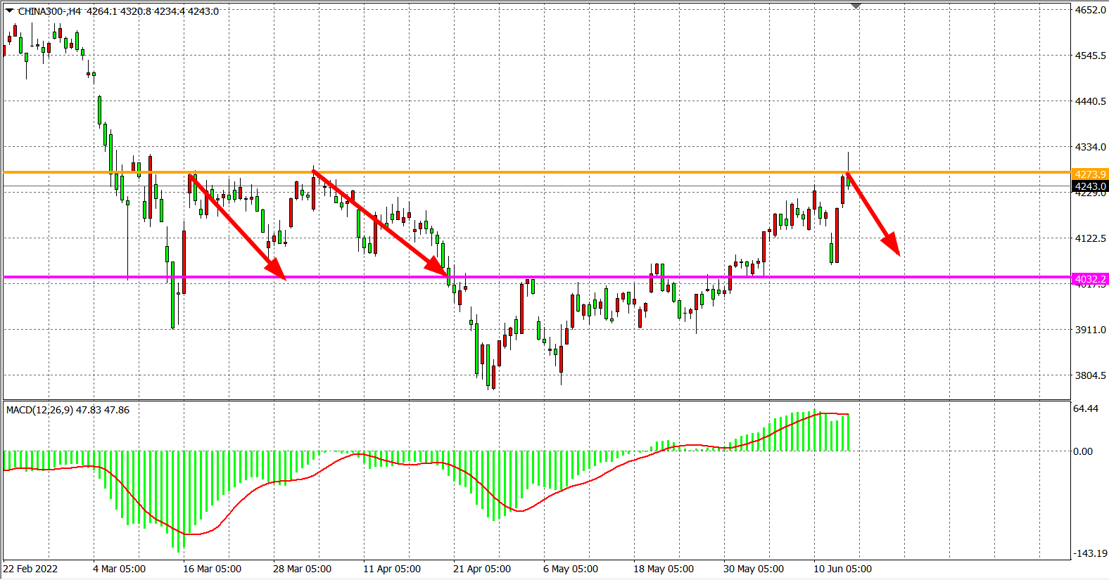 4小时图看,沪深300高开高走但收盘出现回落,最终未能突破4270阻力,该位置作为前期密集成交区,形成明显压制,MACD于零轴之上出现小幅缩量,日内有较大回调风险