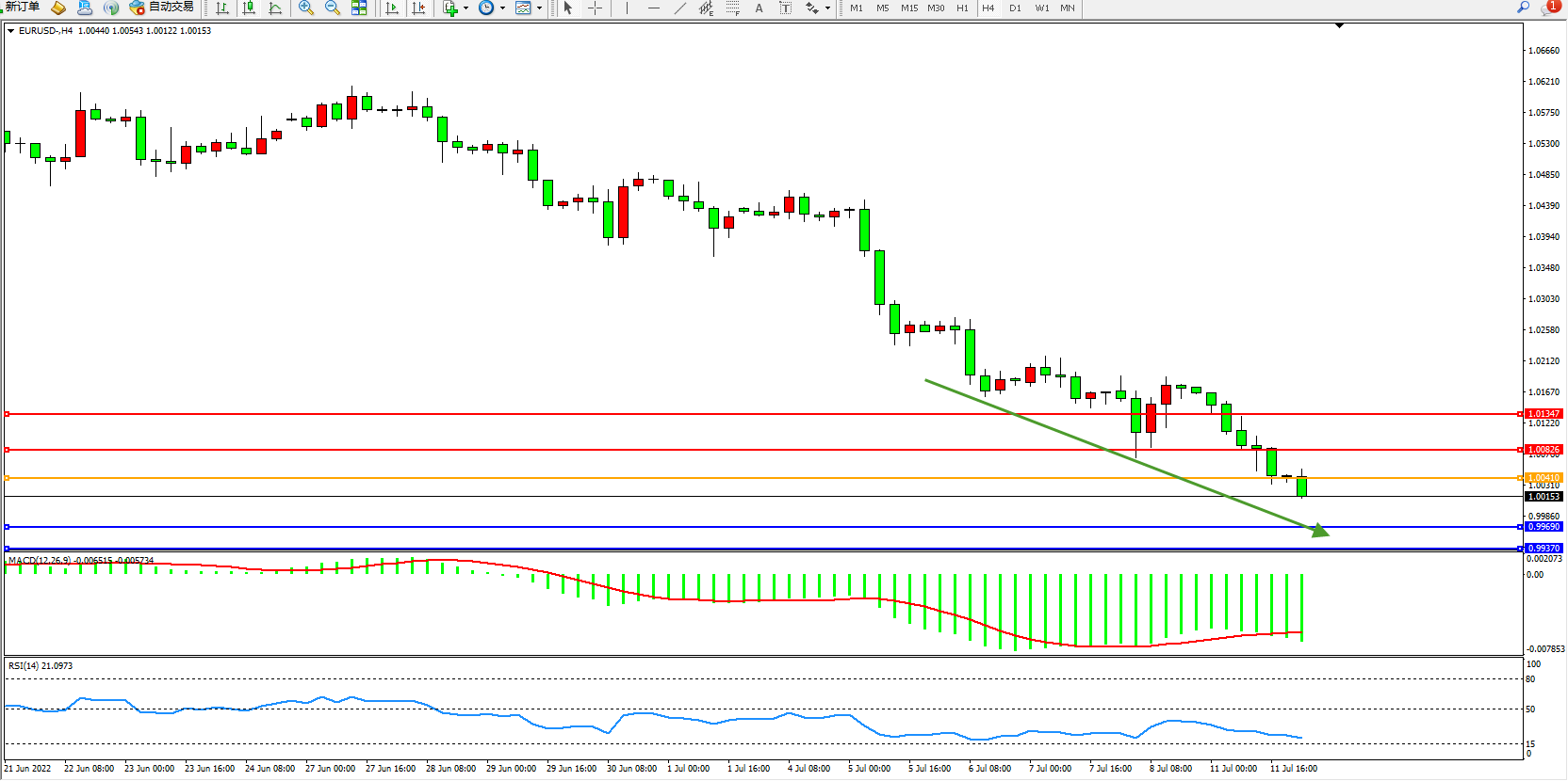 欧元美元EURUSD—4小时K线图显示: