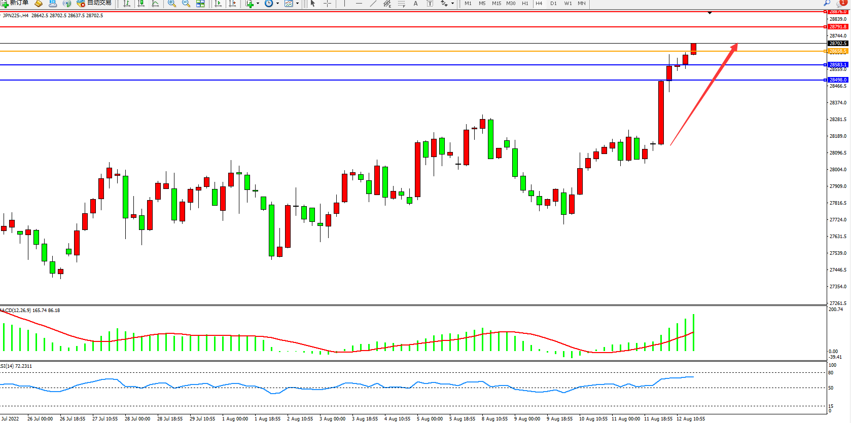 4小时图看:多头动力 强势拉升上扬,短期看涨情绪或将延续,MACD指标处于多头区域持续攀升,RSI指标处于多头区域维持整理上移;