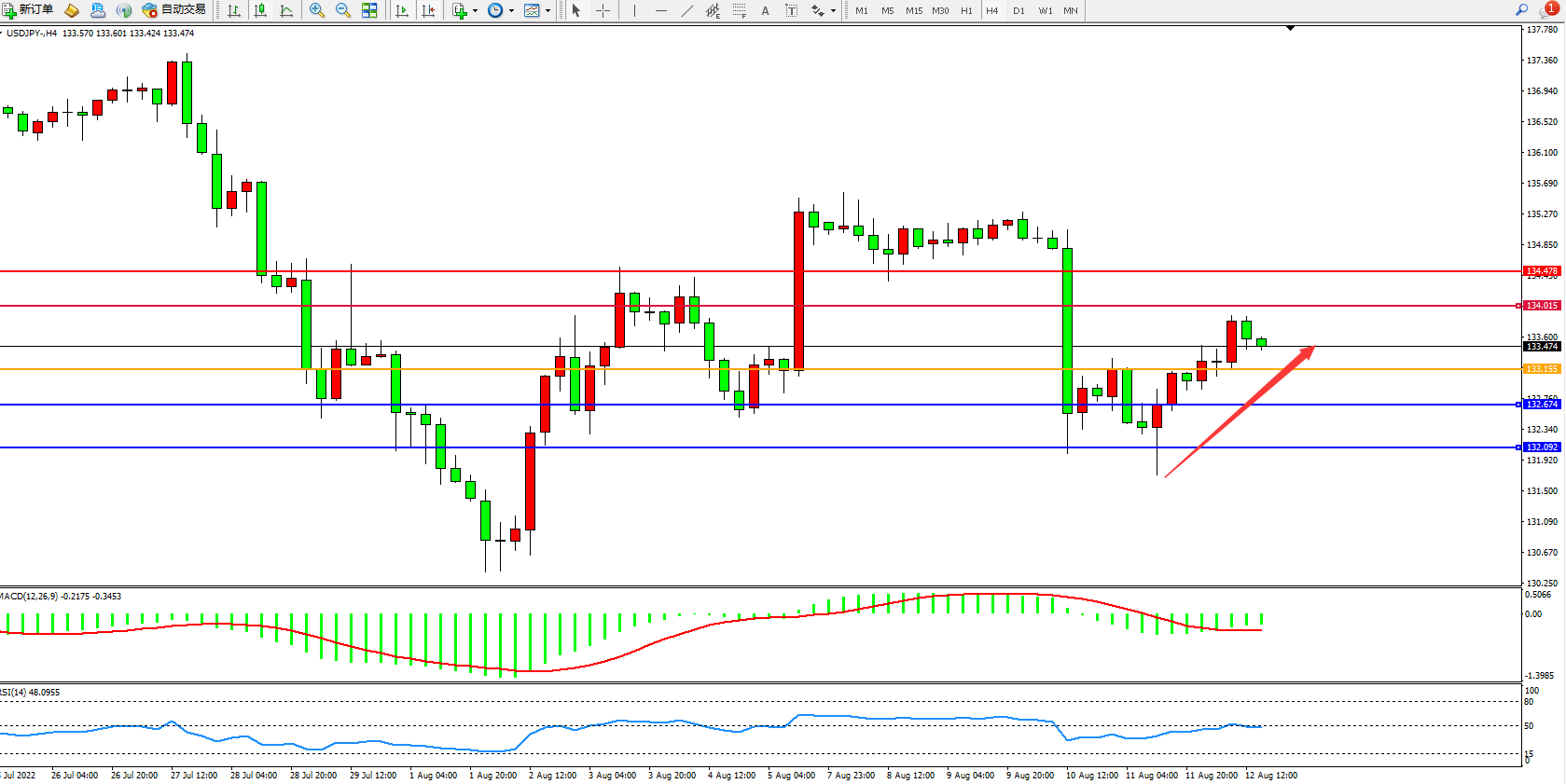 交易策略:133.155上方看涨,目标134.015、134.478