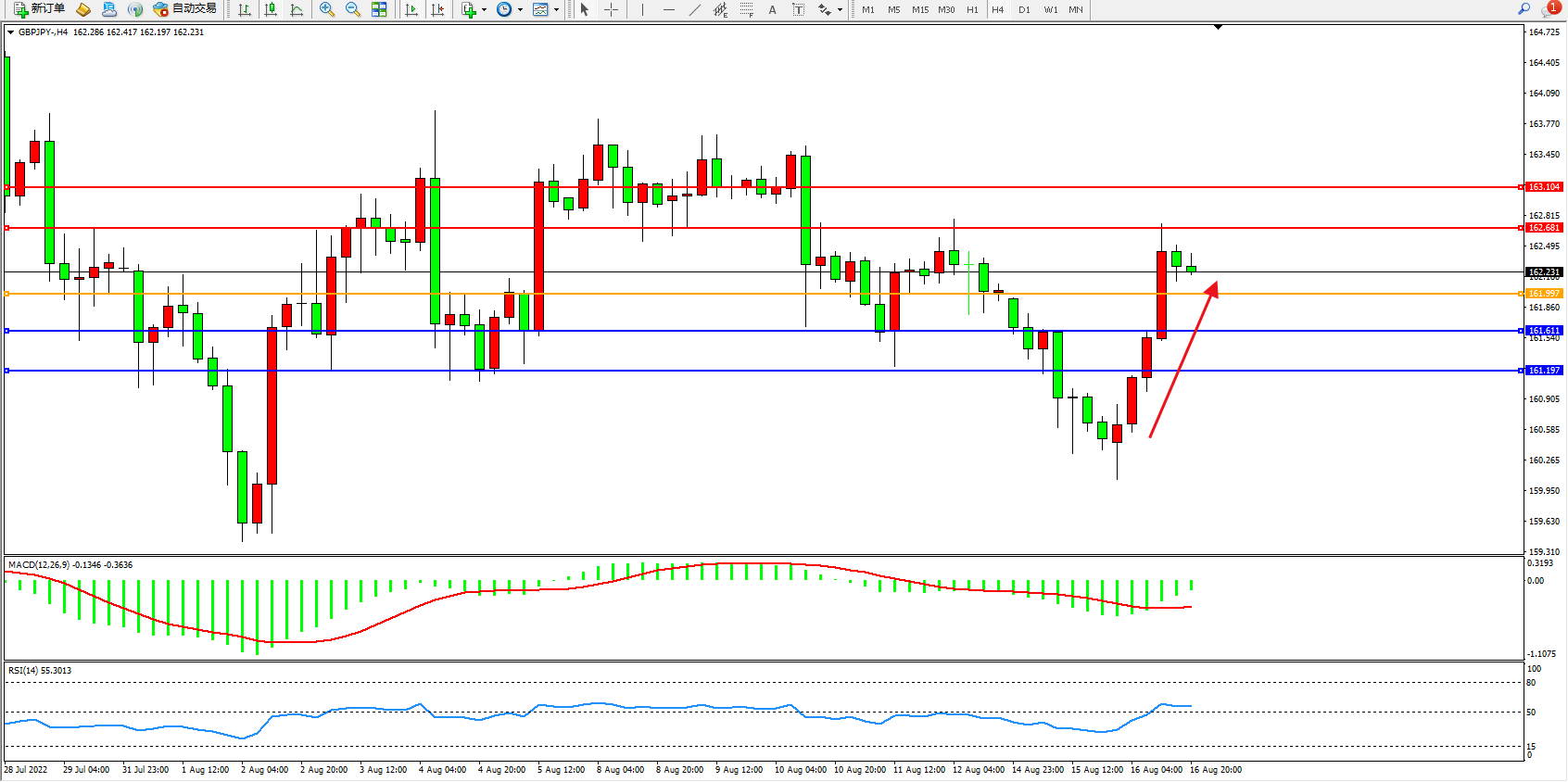 4小时图看:低位多头动力强势拉升上扬,短期有继续向上移动态势,MACD指标处于空头区域维持震荡上移,RSI指标处于50均衡线上側徘徊;