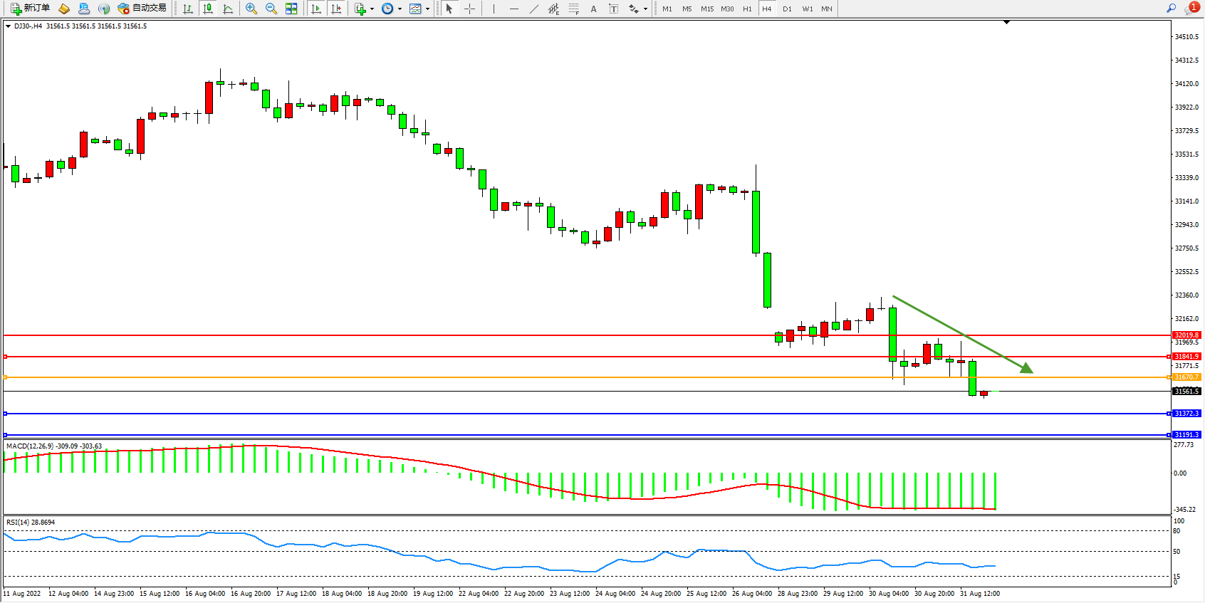 道琼斯指数8月31日(周三)收盘下跌280.17点,跌幅0.88%,报31510.70点;美国8月ADP就业人数增长超前值但不及预期,美联储官员不断重申,即便经济增长受阻,失业率上升,通胀依然是美国经济面临的主要威胁,美联储将坚持现行的大幅加息政策,直到确认通胀真正开始回落。