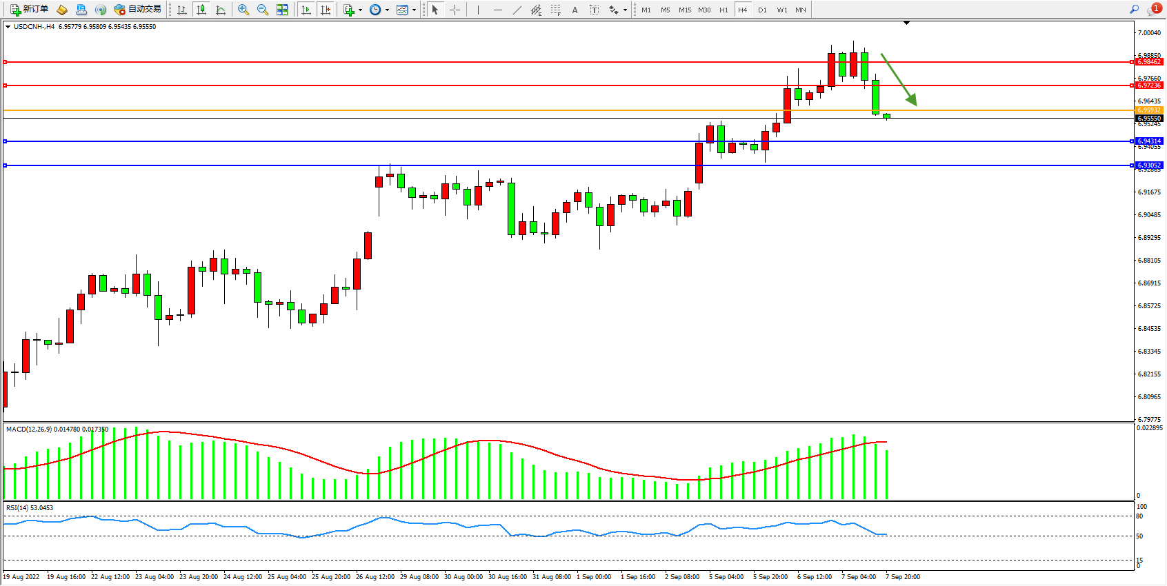 美元人民币USDCNH——4小时K线图显示: