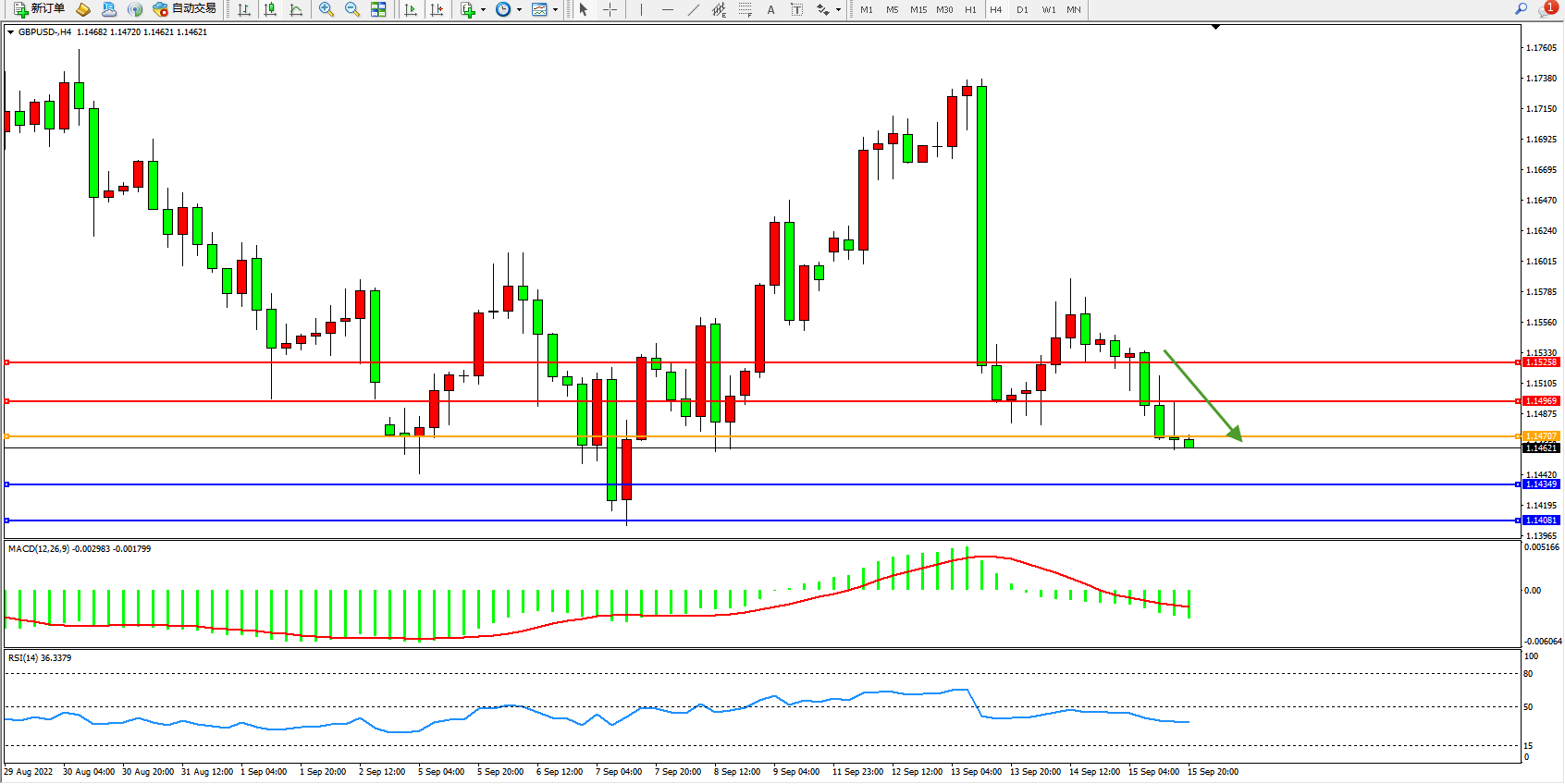 交易策略:1.14707下方看跌,目标1.14349、1.14081