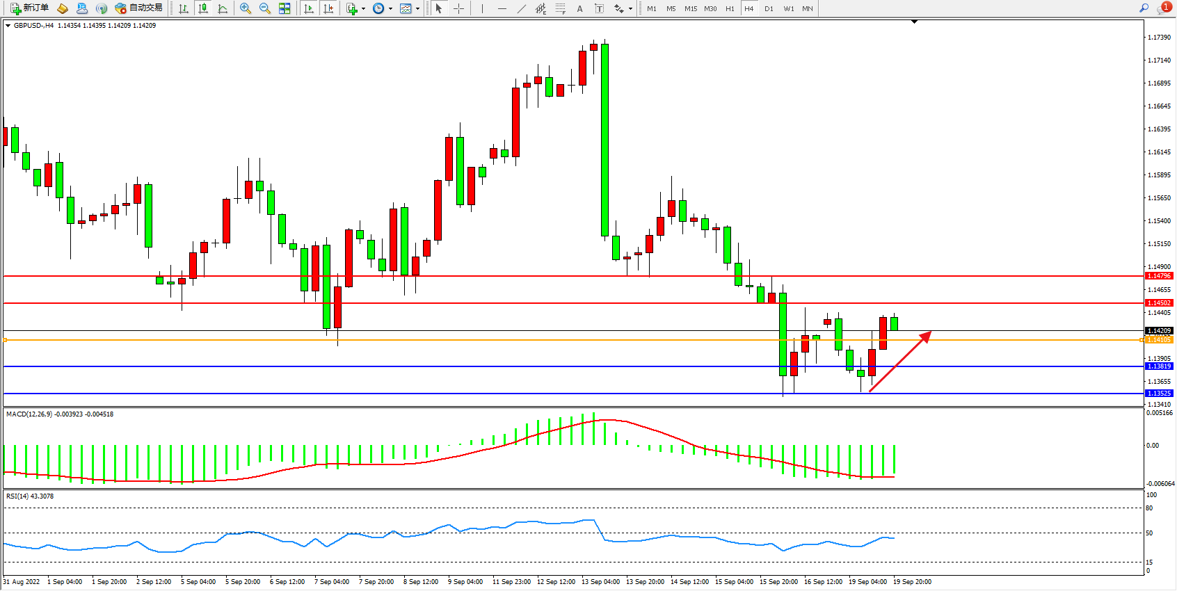 英镑兑美元维持1.14209附近震荡,英国央行在9月22日加息的力度不会像美联储那么大,可能会选择加息50个基点至2.25%。鉴于市场预期英国央行将加息75个基点,英国央行的这一决定将令英镑进一步承压。