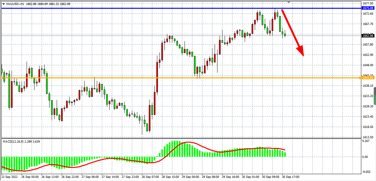 1小时图看,金价反弹1675出现连续受阻,目前短期欲形成“双顶”形态,MACD于零轴之上也开始小幅放,但相比前一波量能已形成背离,显示行情或面临抛压,日内在1675之下看回调,目标看下方1650-1640。