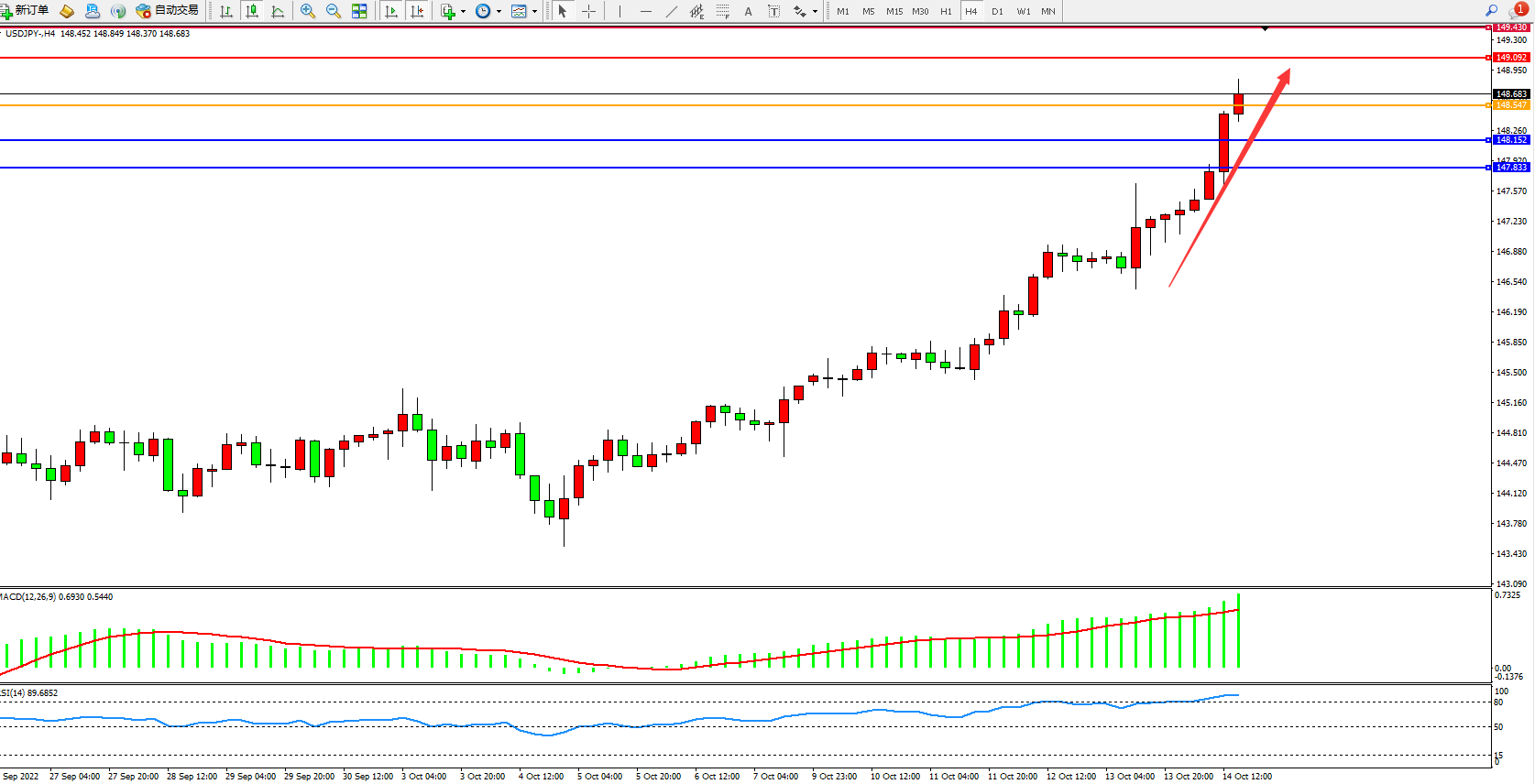 美元兑日圆维持148.683附近震荡,日本央行行长黑田东彦在华盛顿的联合新闻发布会上重申了其奉行宽松货币政策的承诺,这进一步加剧了日本央行与美联储之间的政策分期。因此在美元息口进一步有提升的前景之下,美元兑日始终尝试往更高水位挺进。