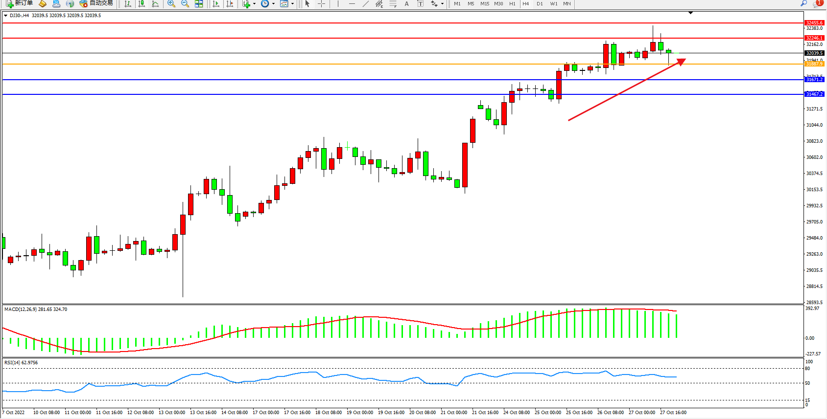道琼斯指数10月27日(周四)收盘上涨198.72点,涨幅0.62%,报32037.83点;美国三季度实际GDP年化季率初值实际公布2.60%,数据超出预期,创2021年第四季度以来新高,此前曾连续两个季度录得负增长。