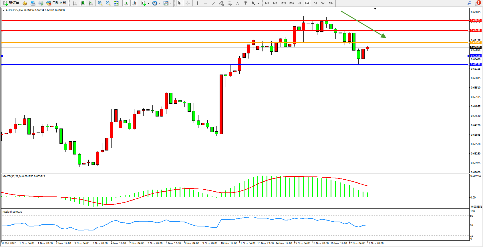 交易策略:0.67047下方看跌,目标0.66588、0.66295