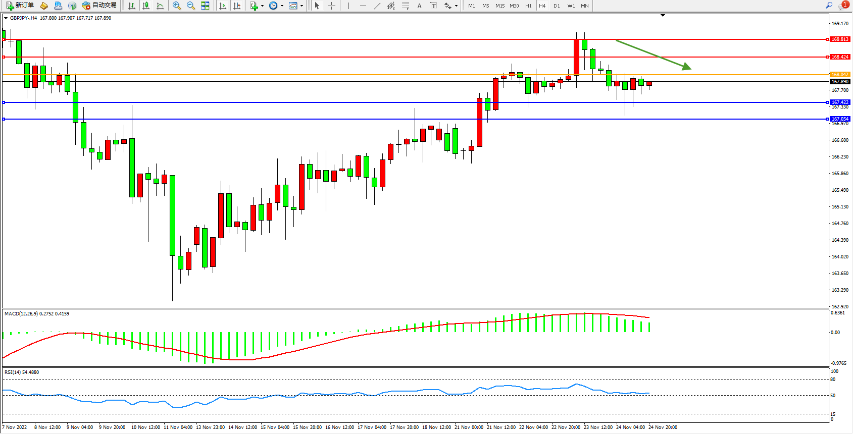 备选策略:168.042上方看涨,目标168.424、168.813