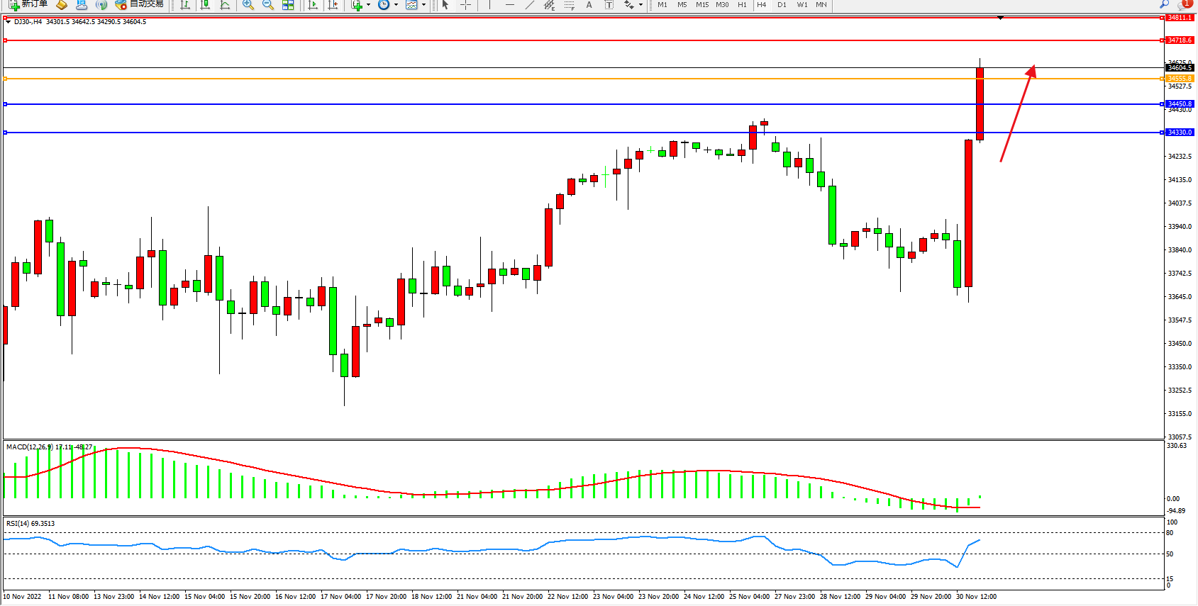 道琼斯指数11月30日(周三)收盘上涨734.93点,涨幅2.17%,报34587.46点;美国11月ADP就业人数增加12.7万人,预期20万人,前值23.9万人。为2021年1月以来最小增幅。就业人数明显不及预期。美国国债收益率波动不大,市场没有很兴奋,说明ADP的影响力似乎已经减弱。