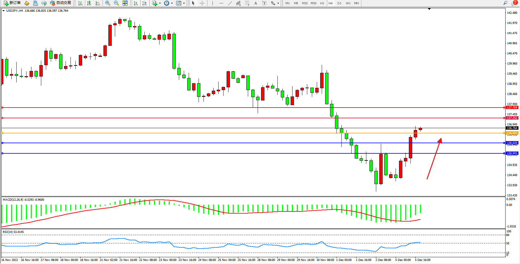 4小时图看:低位多头动力持续拉升上扬,短期看涨情绪态势良好,市场多头持续攀升,MACD指标处于空头区域持续震荡上扬,RSI指标处于空头区域震荡上移至0轴线上側徘徊;