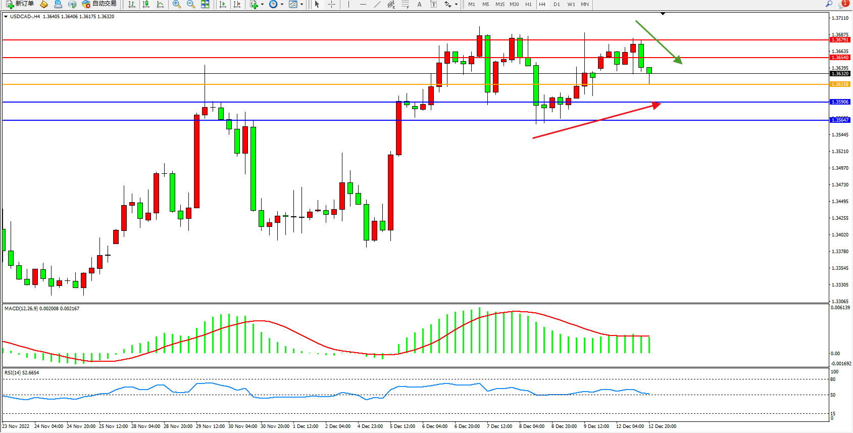 美元加元USDCAD——4小时K线图显示: