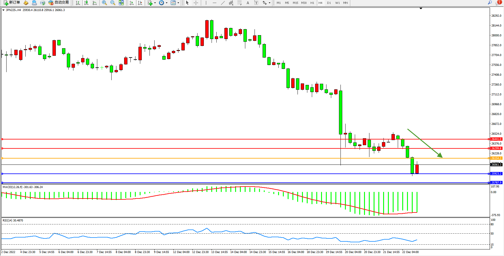 日经225指数12月22日(周四)收盘上涨114.78点,涨幅0.43%,报26502.50点。日本政府上调下一财政年度的增长预测,归因于企业支出增加和工资大幅上涨的前景。企业支出增加和工资大幅上涨料将支撑消费。