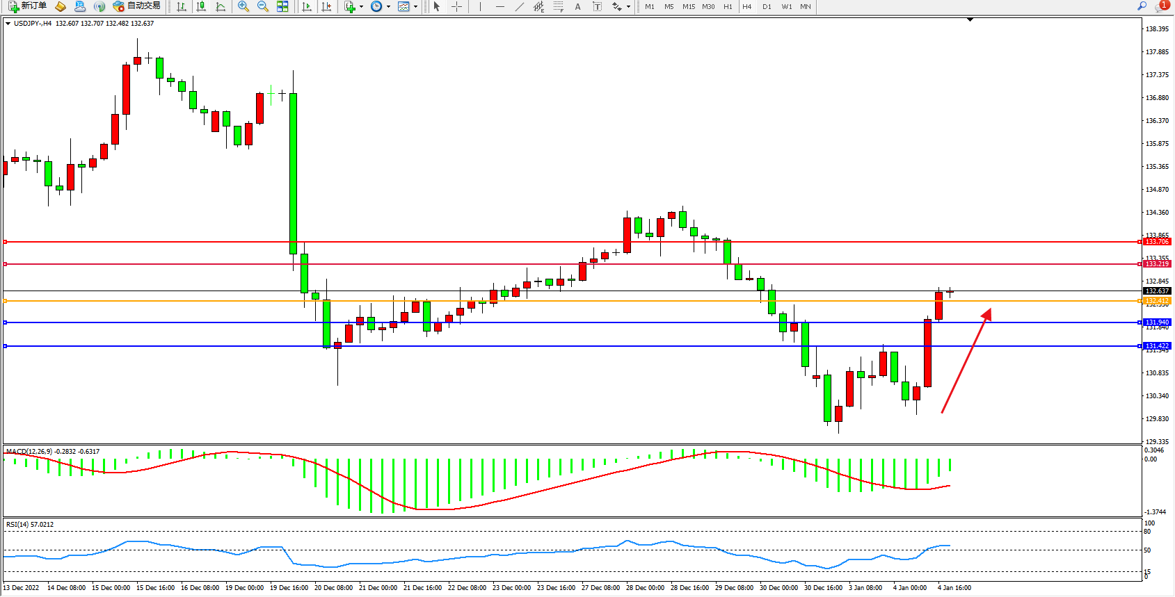 交易策略:132.412上方看涨,目标133.219、133.706