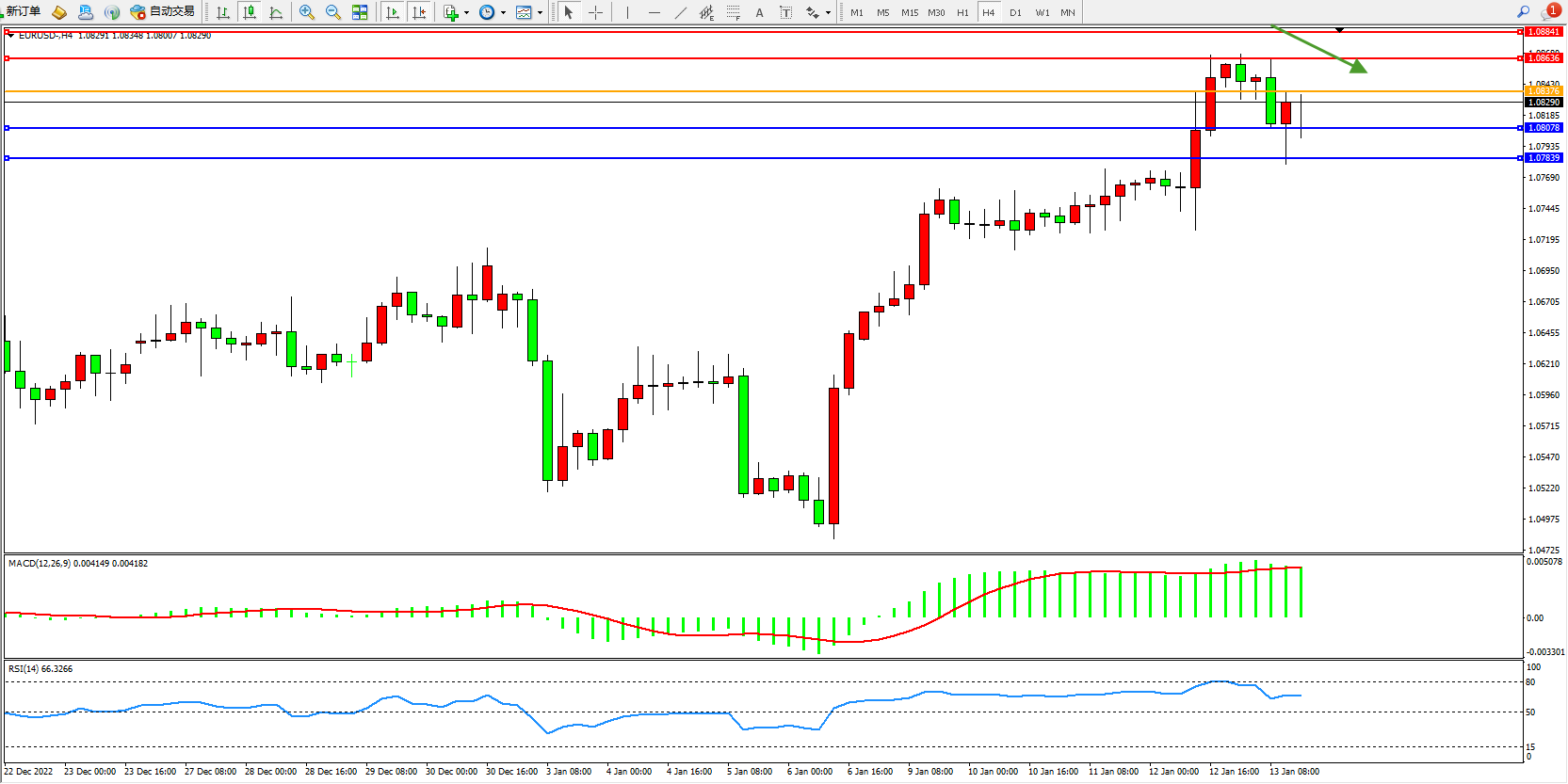 欧元美元EURUSD—4小时K线图显示: