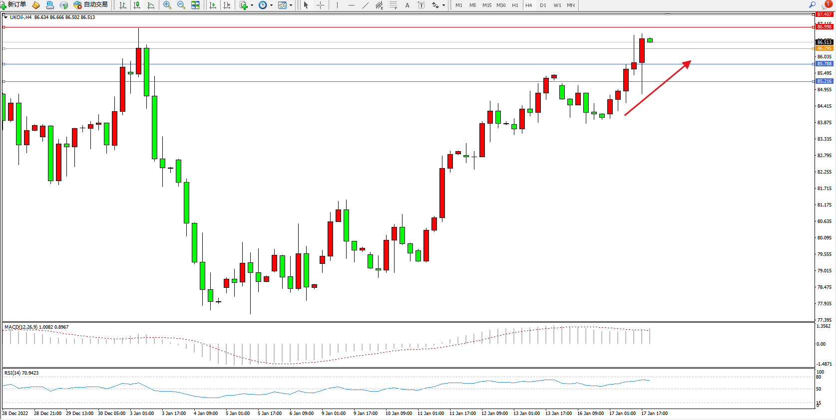 4小时图看:多头动力高位不断拉升,市场多头持续涌现,短期看涨态势良好,MACD指标处于多头区域整理,RSI指标处于多头区域高位徘徊;