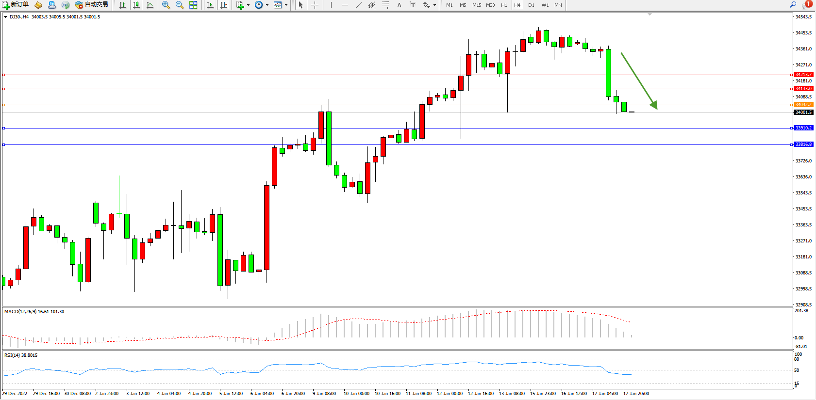 道琼斯指数1月17日(周二)收盘下跌391.39点,跌幅1.14%,报33911.22点;众议院共和党人的债务计划可能导致威胁全球的经济灾难,并将削减对边境安全、食品安全和其他必要政府活动的支付。美国白宫方面表示,国会必须无条件解决债务上限问题。
