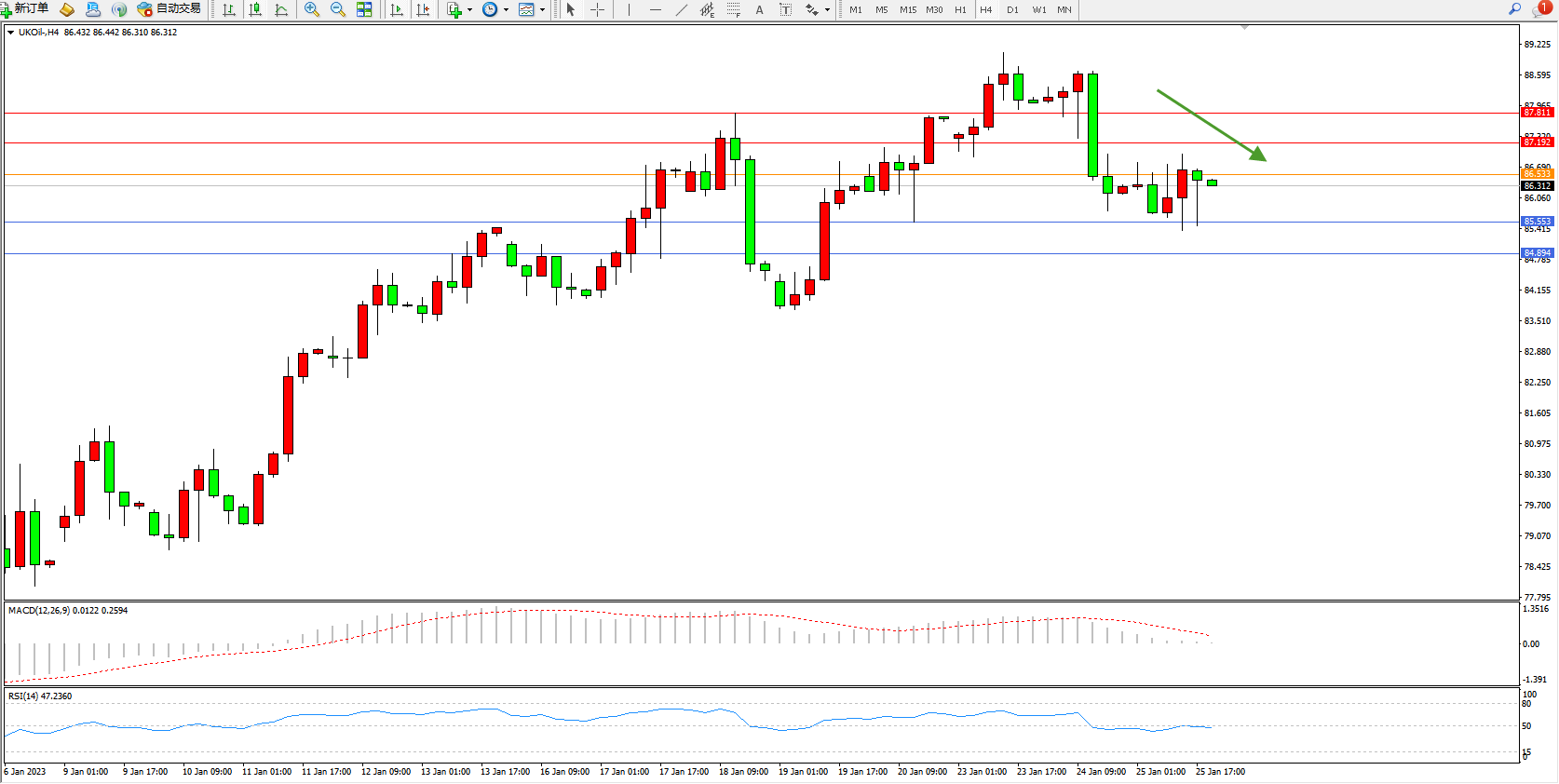 交易策略:86.533下方看跌,目标85.553、84.894