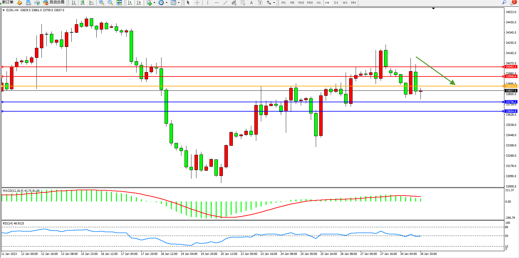 道琼斯指数1月30日(周一)收盘下跌260.40点,跌幅0.77%,报33717.68点;随着美国制造业PMI等经济指标开始显示经济可能正在降温,美联储加息可能会比预期来得更快。交易员押注本周美联储将加息25个基点,并在随后的会议上再次加息25个基点。