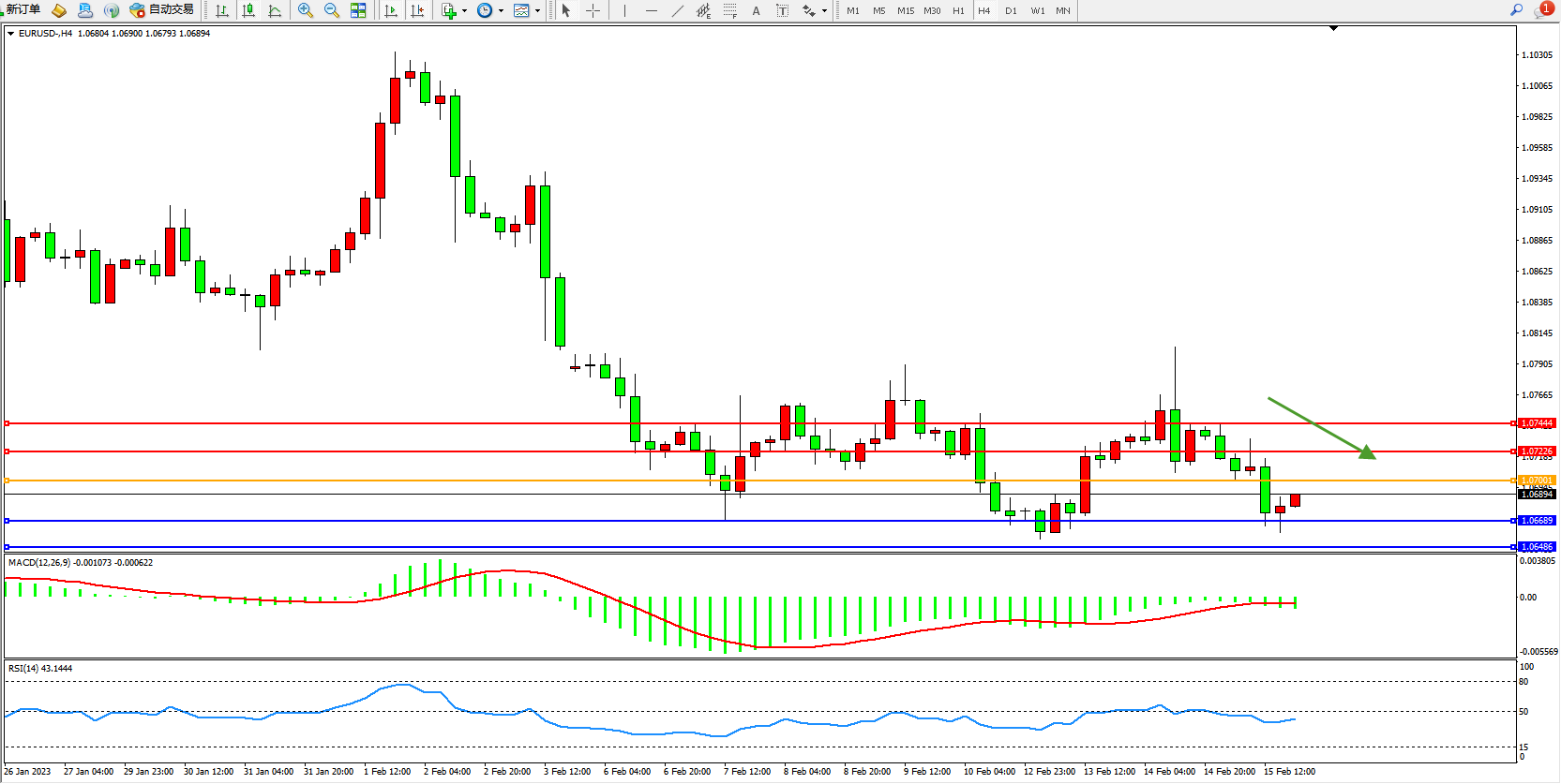 欧元美元EURUSD—4小时K线图显示: