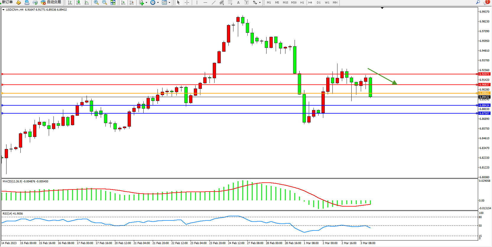 美元人民币USDCNH——4小时K线图显示: