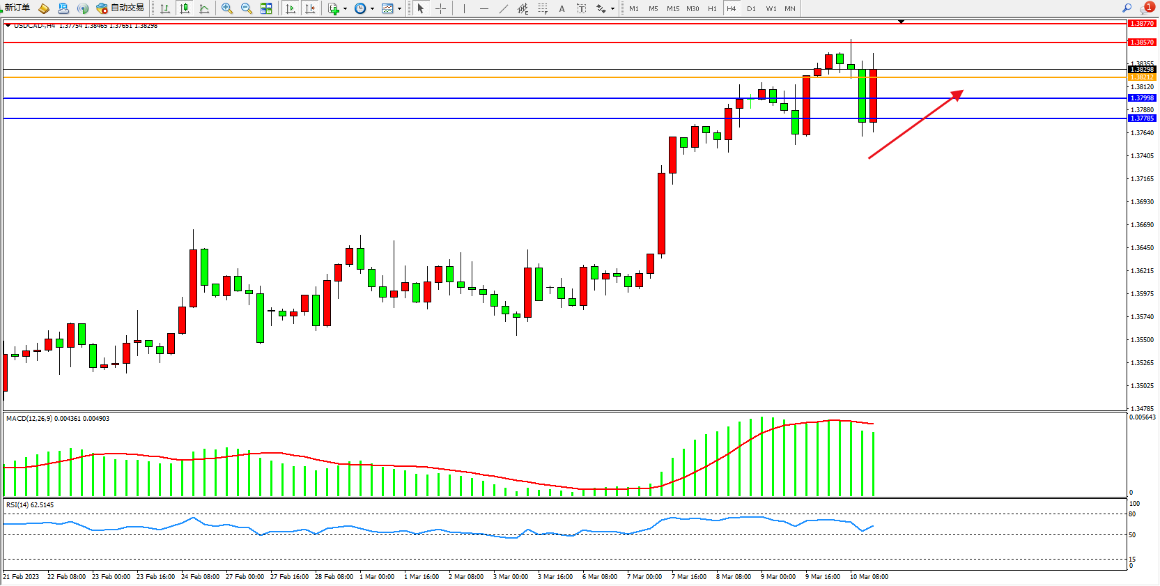 美元加元USDCAD——4小时K线图显示: