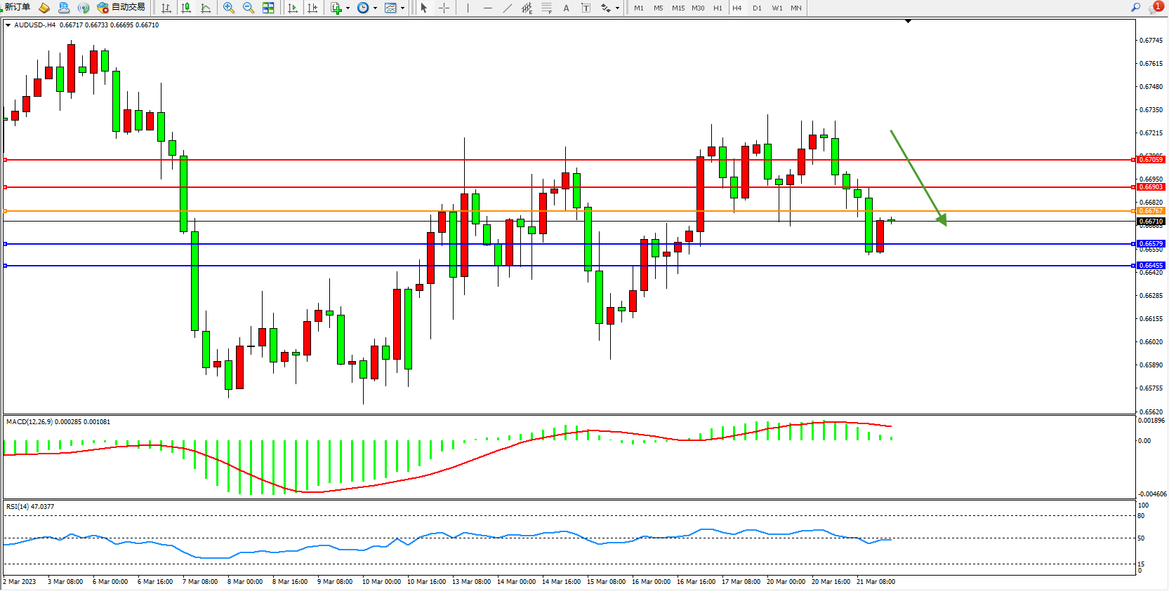 澳元兑美元维持0.66710附近震荡,澳洲央行准备在4月政策会议上考虑暂停升息,在银行业动荡危机下,市场益发排除澳洲央行进一步升息的可能性,这也拖累了澳元;