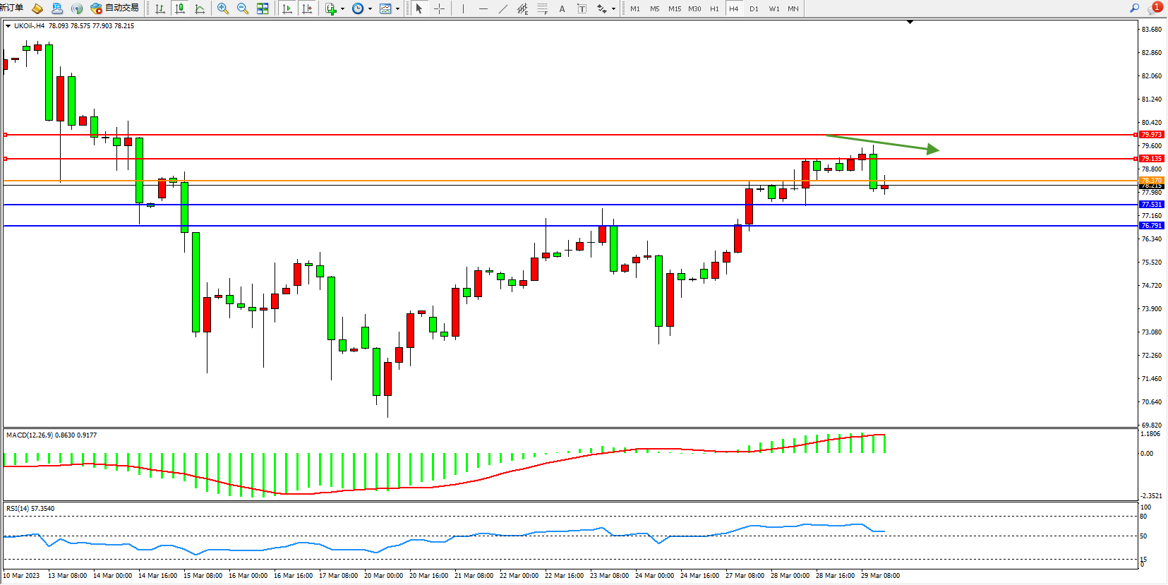 4小时图看:高位短期整理回撤,市场多头动力退去,空头情绪开始逐渐涌现,MACD指标处于多头区域维持整理,RSI指标处于50均衡线上側徘徊;