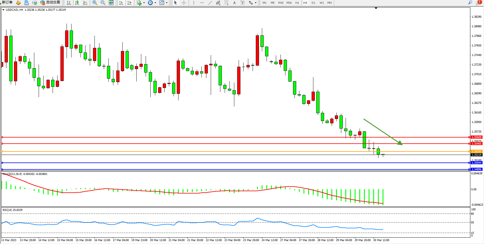 4小时图看:空头动力低位维持震荡下移,短期跌势未见止步,市场空头情绪不断涌现,MACD指标处于空头区域低位下移,RSI指标处于空头区域底位弱势徘徊;
