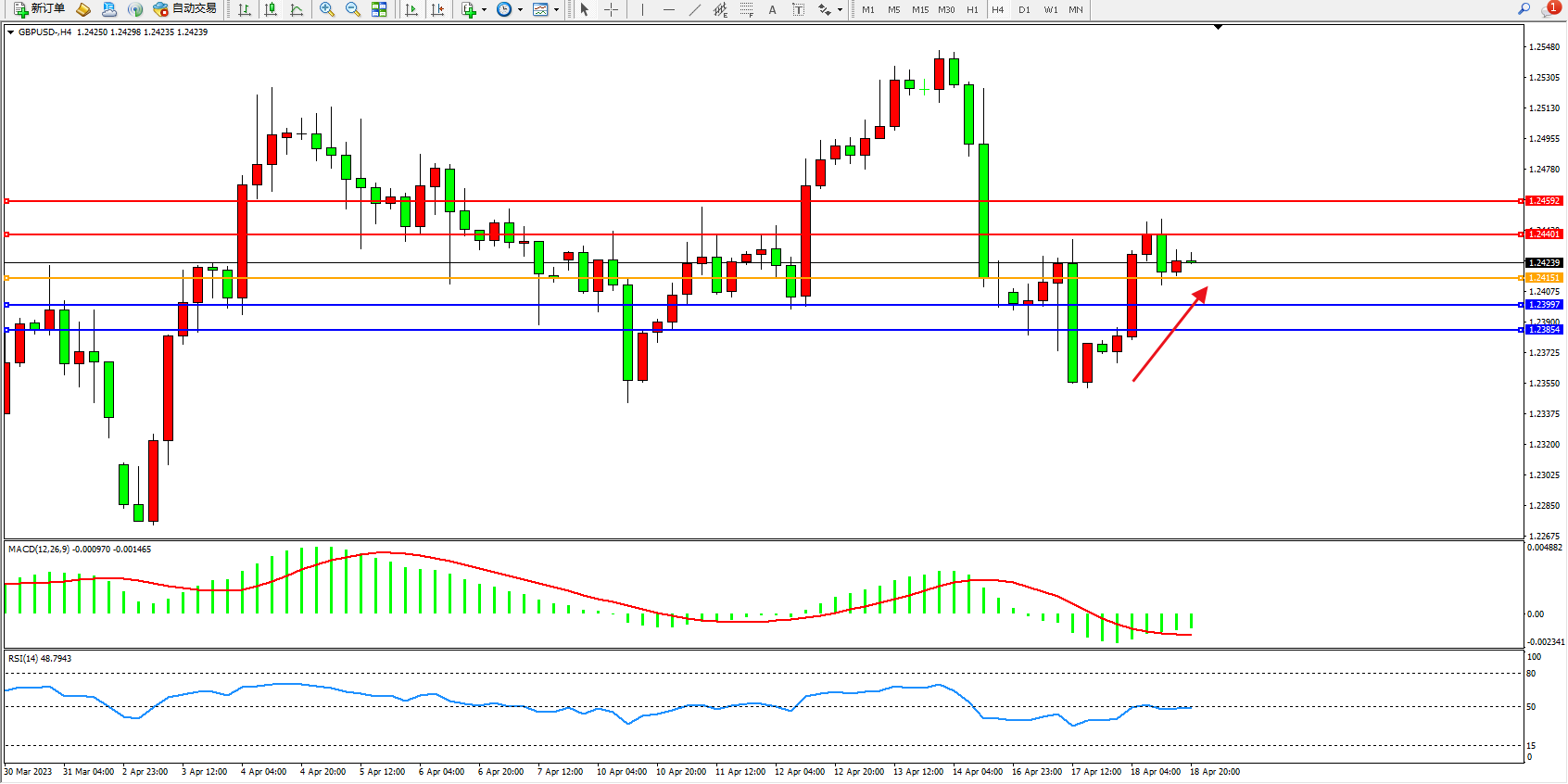 4小时图看:多头动力再度拉升上扬,市场看涨情绪持续,短期或维持整理上移;MACD指标处于0轴线上行整理,RSI指标处于50均衡线附近徘徊;
