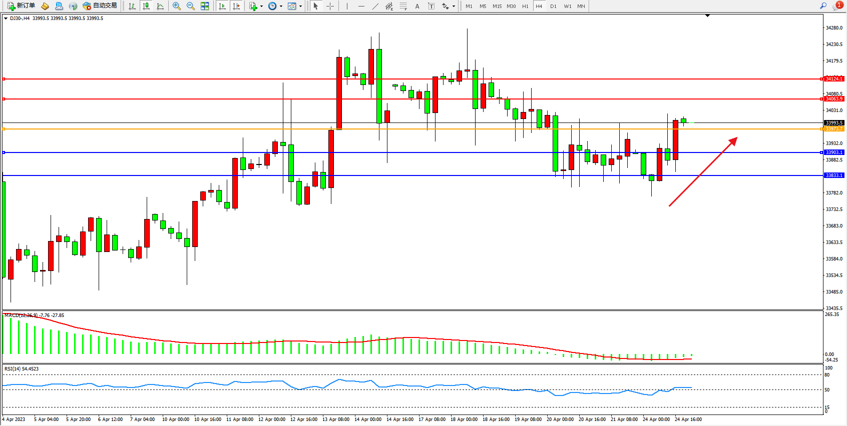 道琼斯指数4月24日(周一)收盘上涨66.96点,涨幅0.20%,报33875.92点;投资者将等待本周美国的经济数据,以了解美联储下一步可能采取的行动。