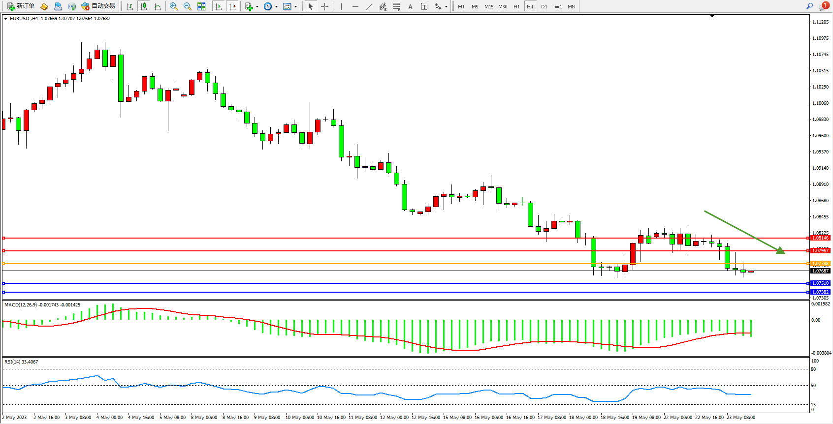 欧元美元EURUSD—4小时K线图显示:
