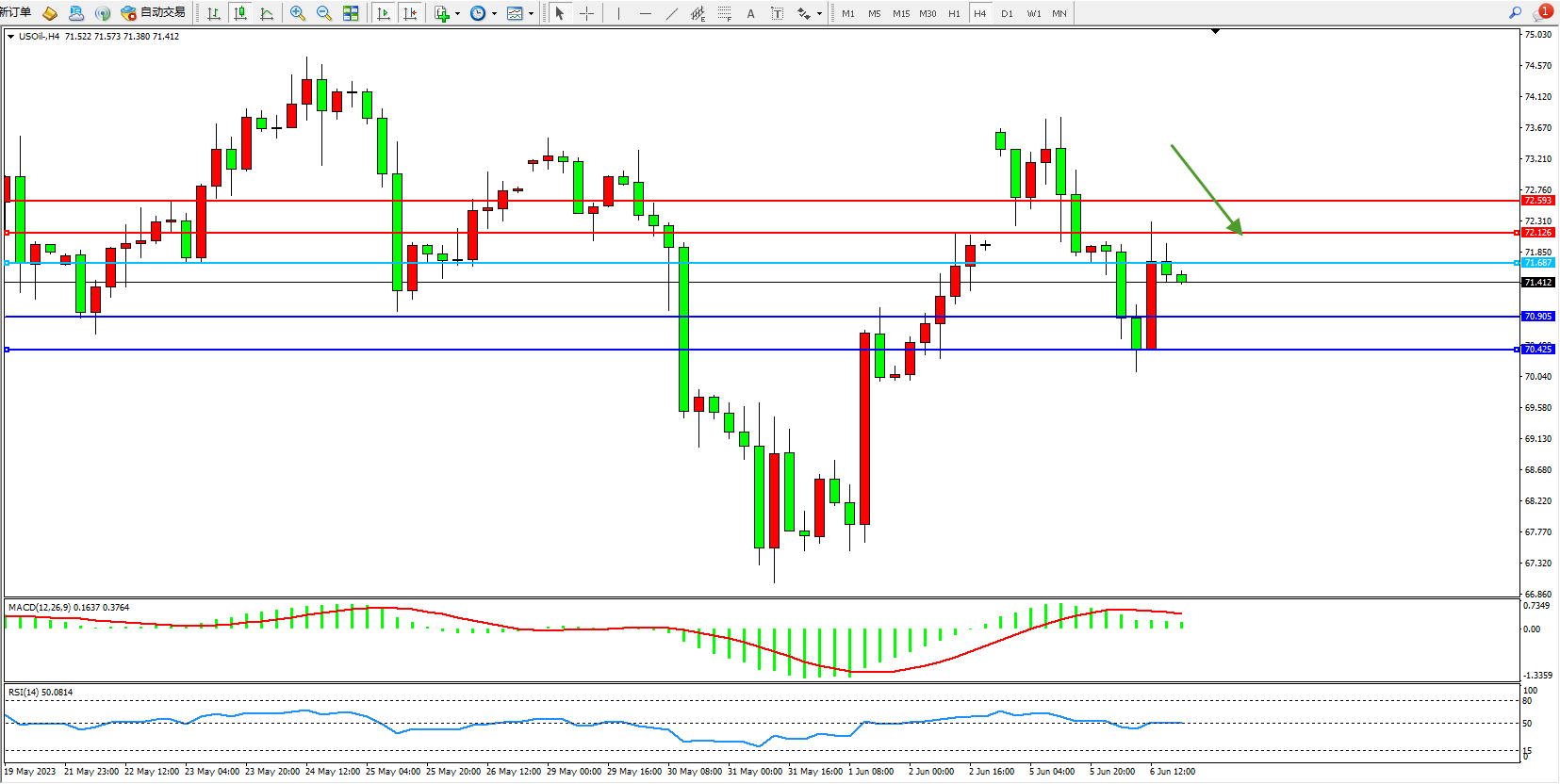 原油USOil——4小时K线图显示: