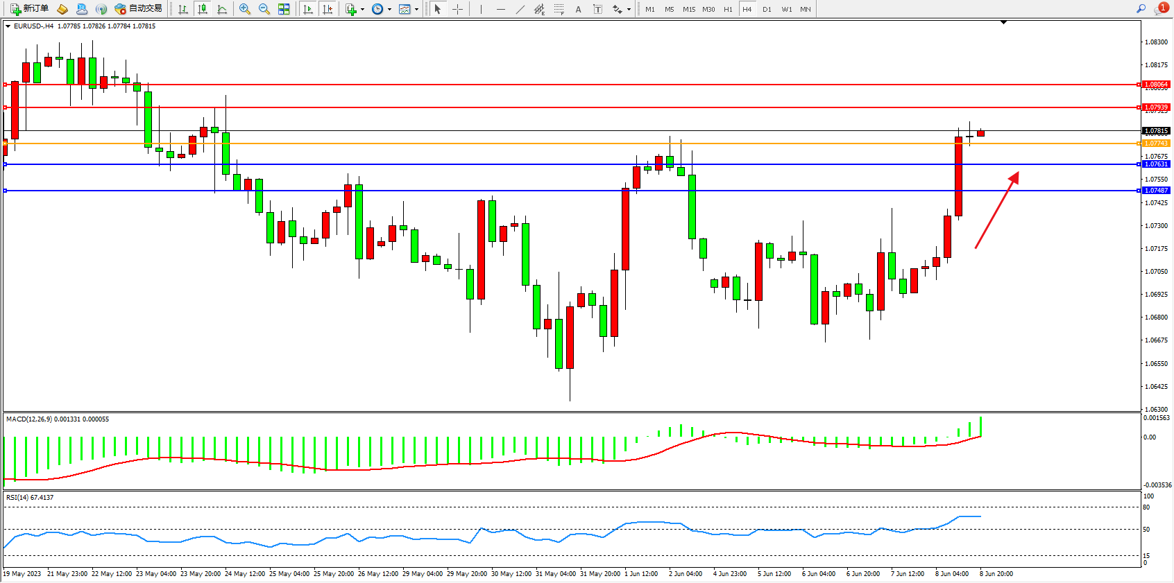 4小时图看:多头动力强势震荡上扬,短期看涨情绪依旧,市场多头不断攀升中,MACD指标处于多头区域持续上移,RSI指标处于多头区域高位整理;