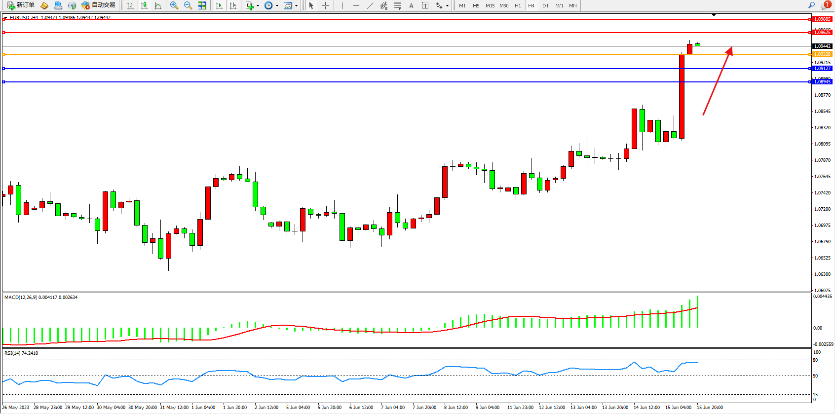 欧元美元EURUSD—4小时K线图显示: